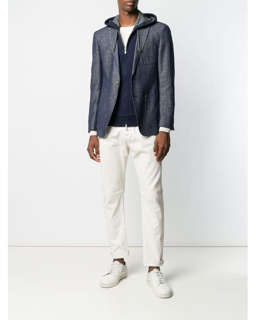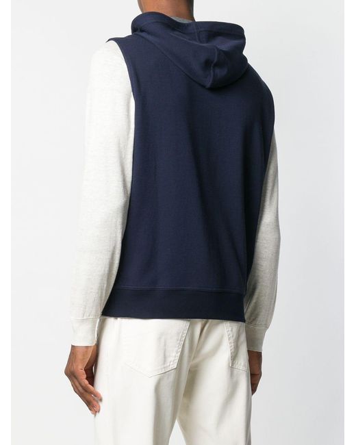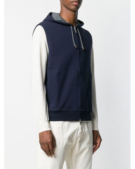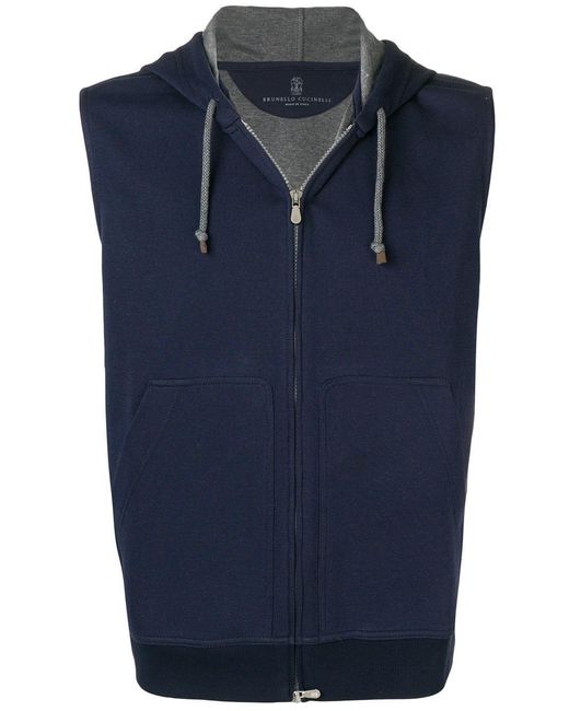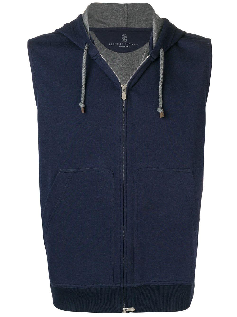 Mouwloze hoodie van Brunello Cucinelli uitgevoerd in gemixt katoen voorzien van capuchon met trekkoorden, geribde zoom, rits aan de voorkant en kangaroe zakken. Kleur: blauw
