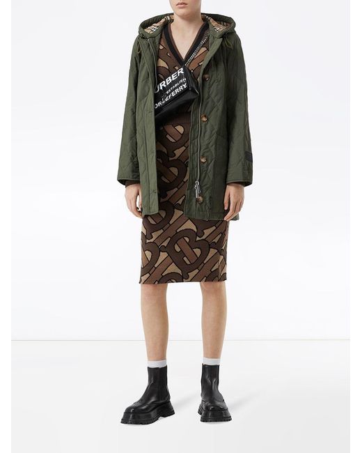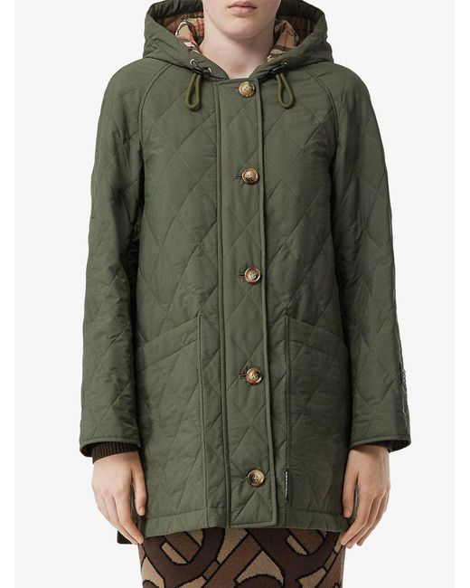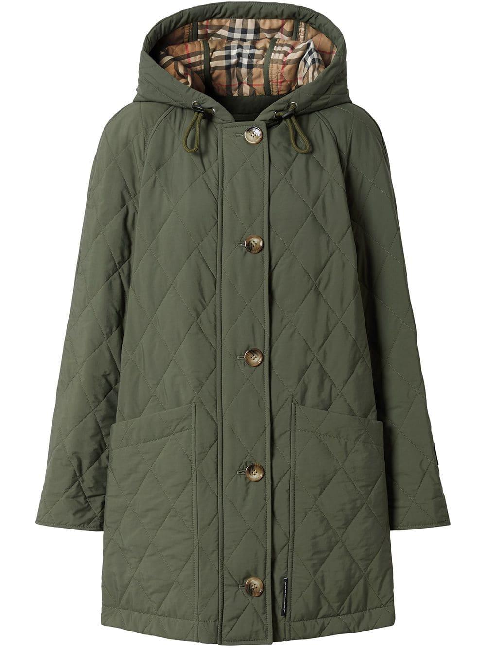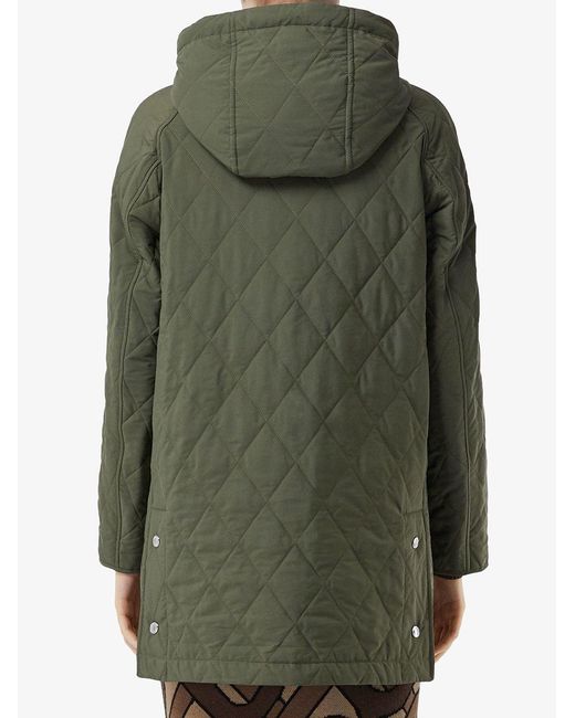 Gevoerde jas van Burberry uitgevoerd in gemixt katoen voorzien van capuchon met trekkoorden, knoopsluiting aan de voorzijde, verborgen ritssluiting, opgestikte zakken, lange mouwen, korte lengte, dubbele split aan de achterzijde en rechte zoom. Kleur: groen