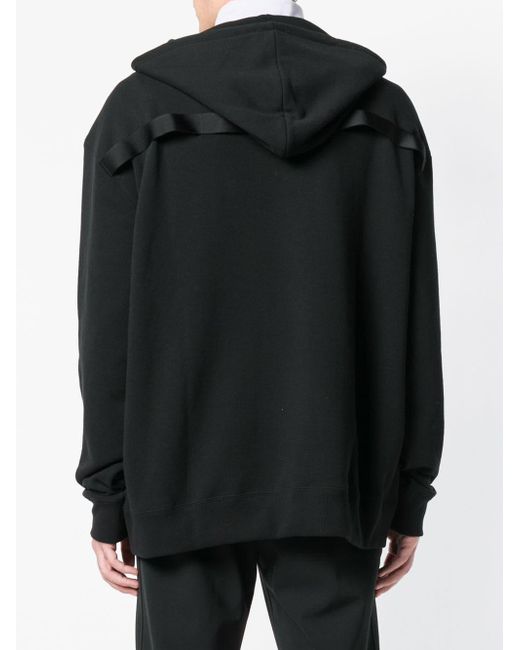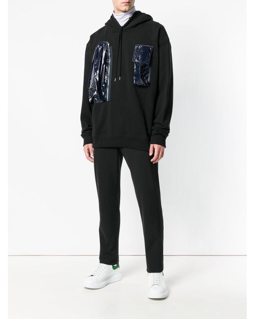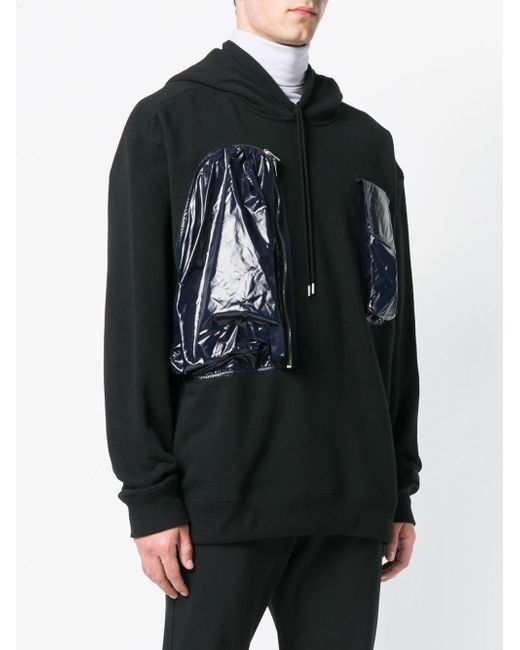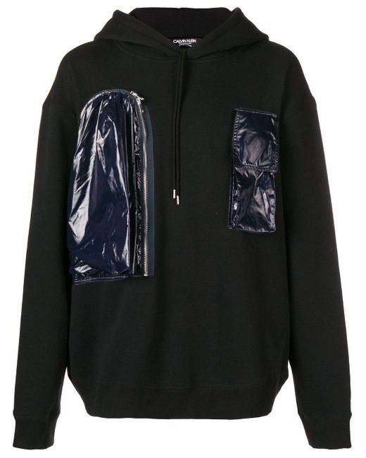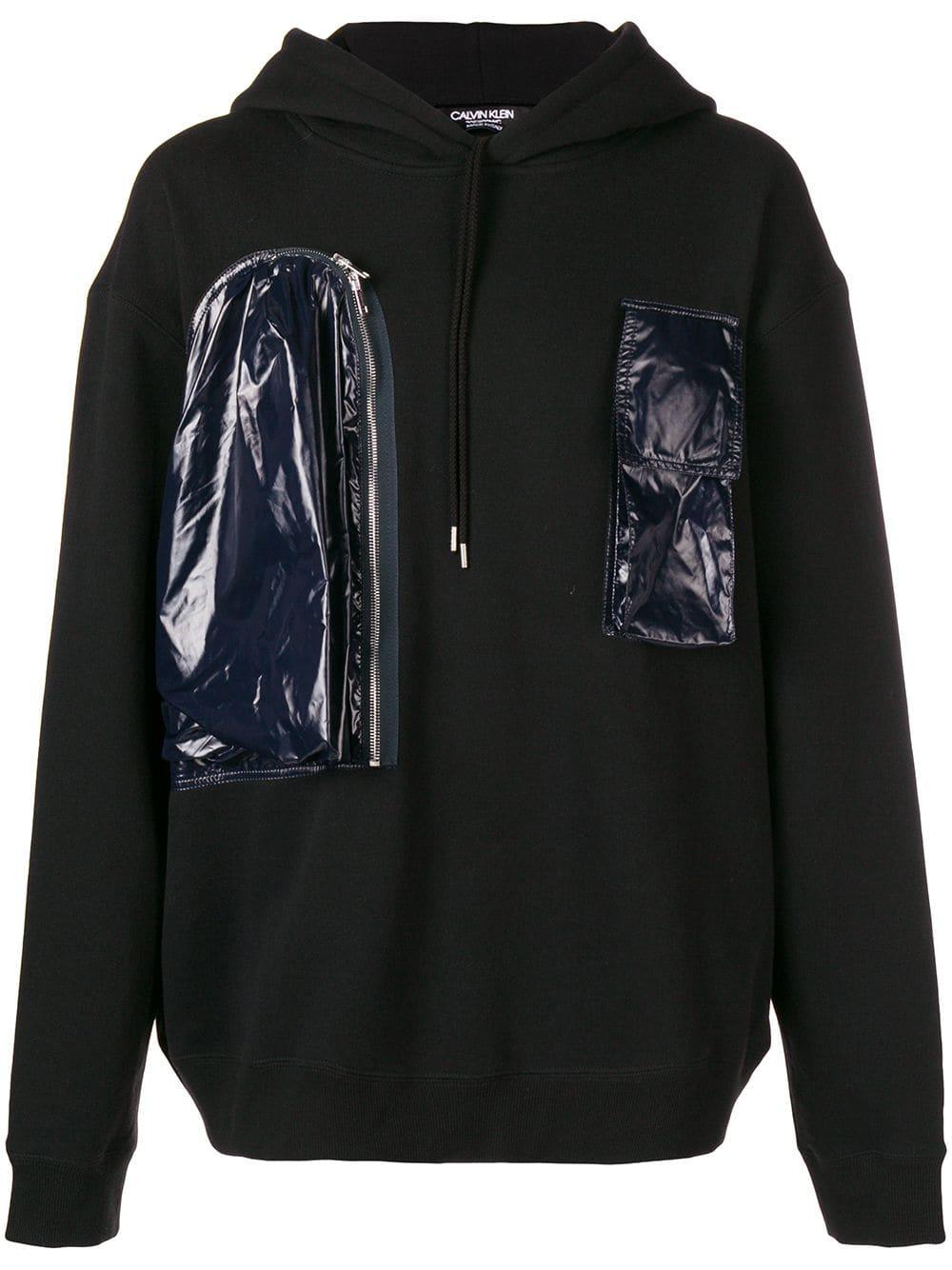 The Calvin Klein 205W39NYC AW18 collection was imbued with ideas and strange hybrids, offering styles with juxtaposing elements, often within same silhouette. Made from cotton, this black hoodie has a relaxed fit, with long sleeves and a drawstring hood, and it features contrasting navy nylon patches on the front. Kleur: zwart