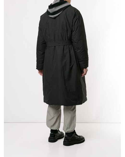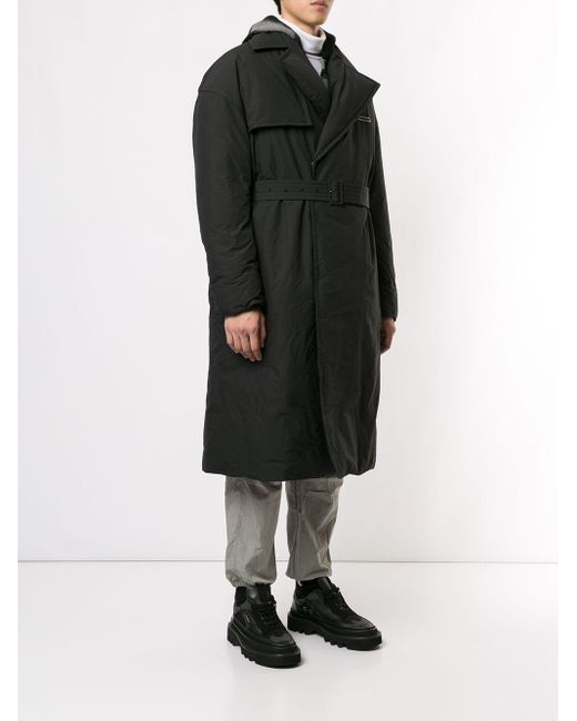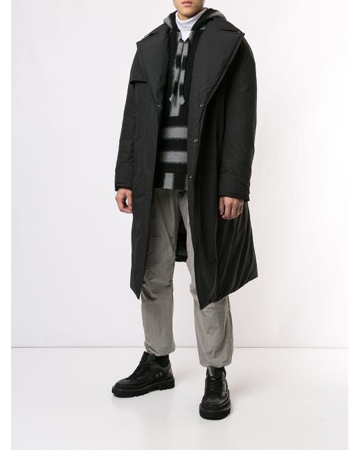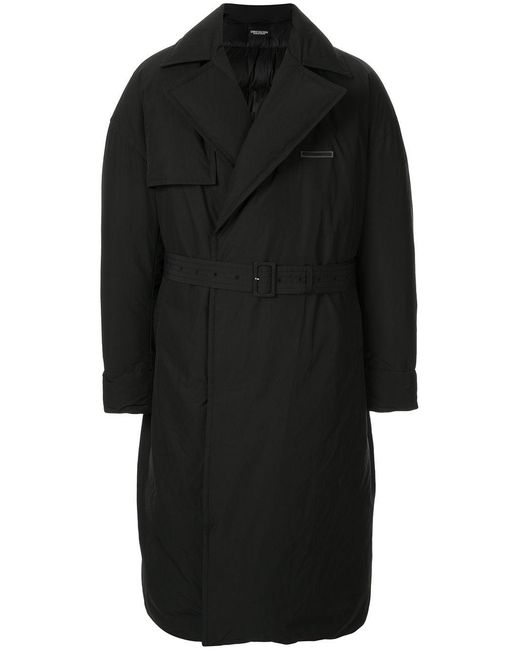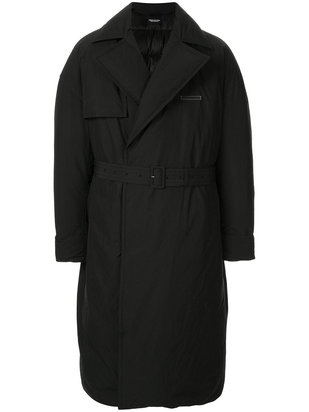 Trenchcoat van Christian Dada voorzien van gewatteerde binnenkant, brede revers, verborgen sluiting voorzijde, lange mouwen, ceintuur, rechte zoom en middellange lengte. Kleur: zwart