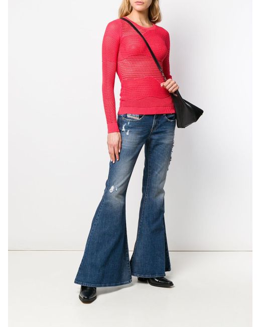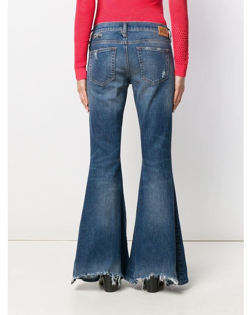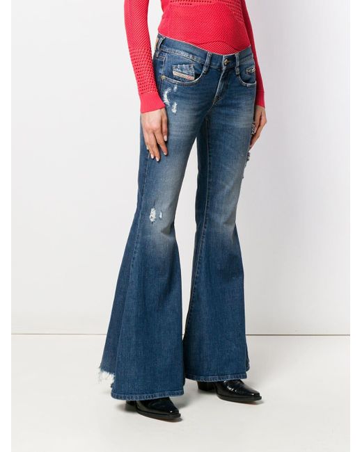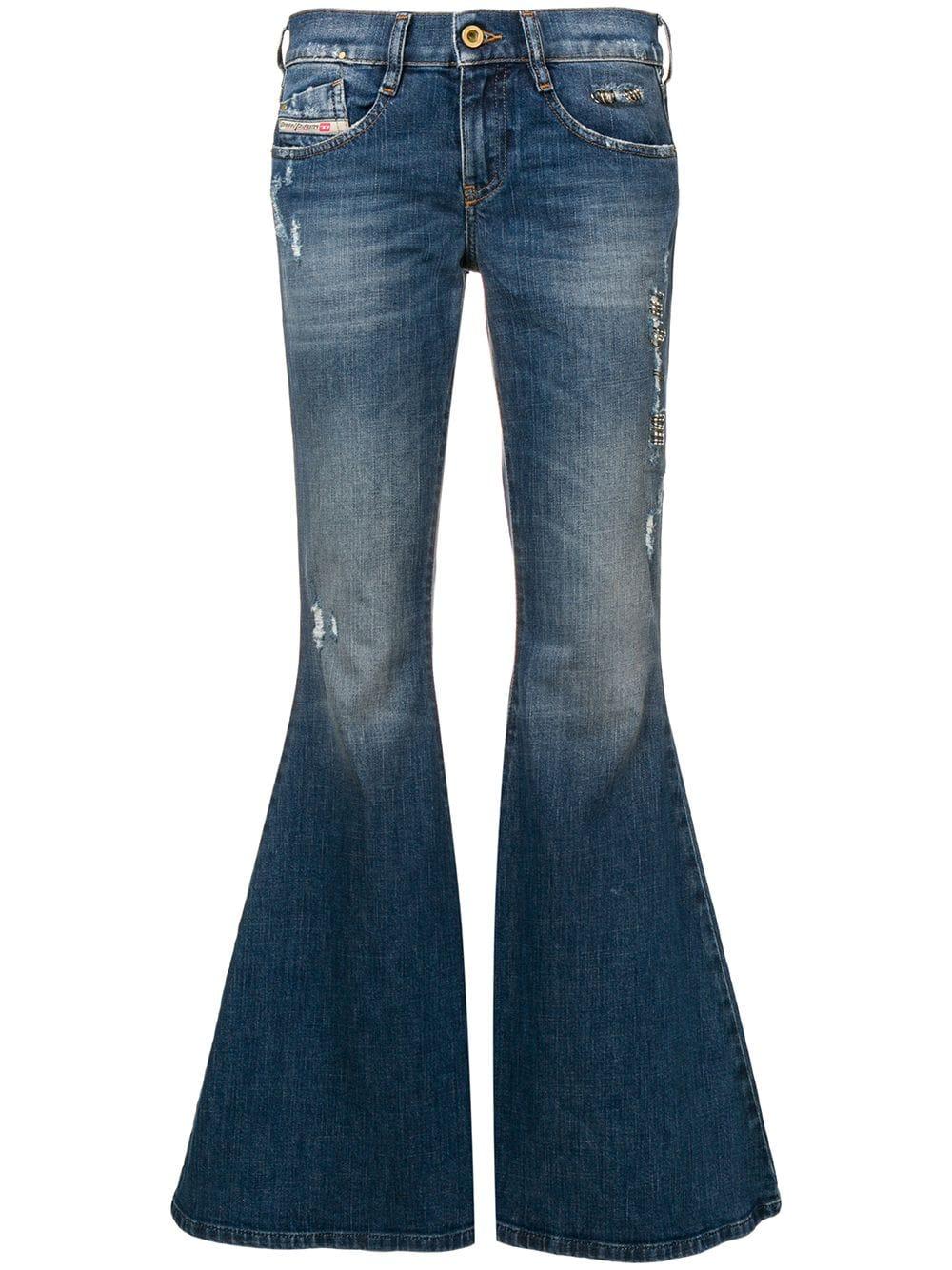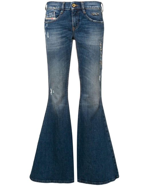 Flared jeans van Diesel voorzien van low-rise, tailleband met riemlussen, five-pocket-design, distressed-effect, stonewash- effect, gerafelde zoom en logo op achterzijde. Kleur: blauw