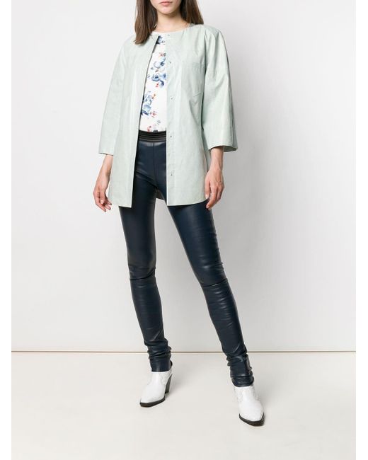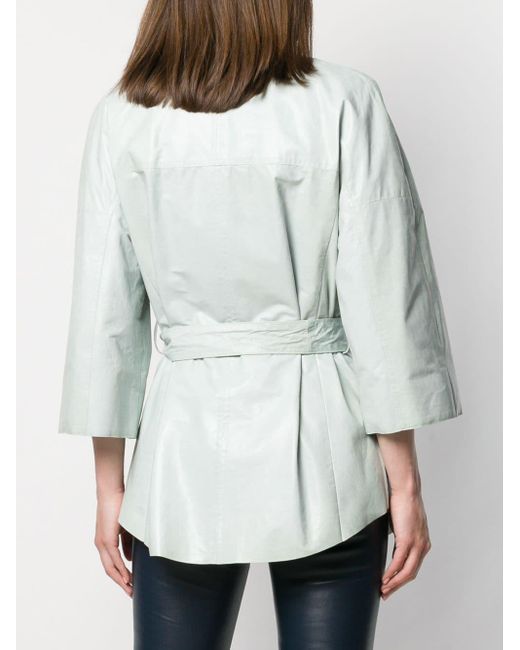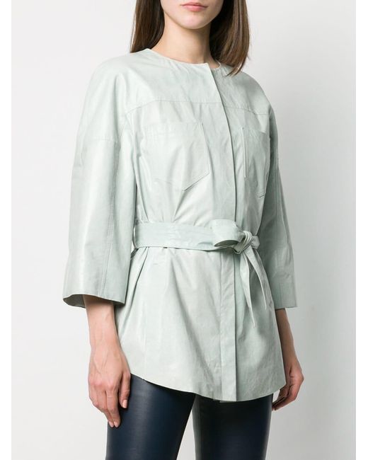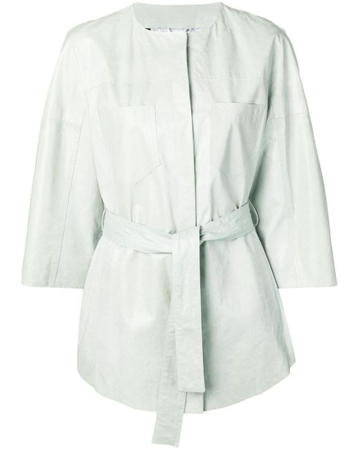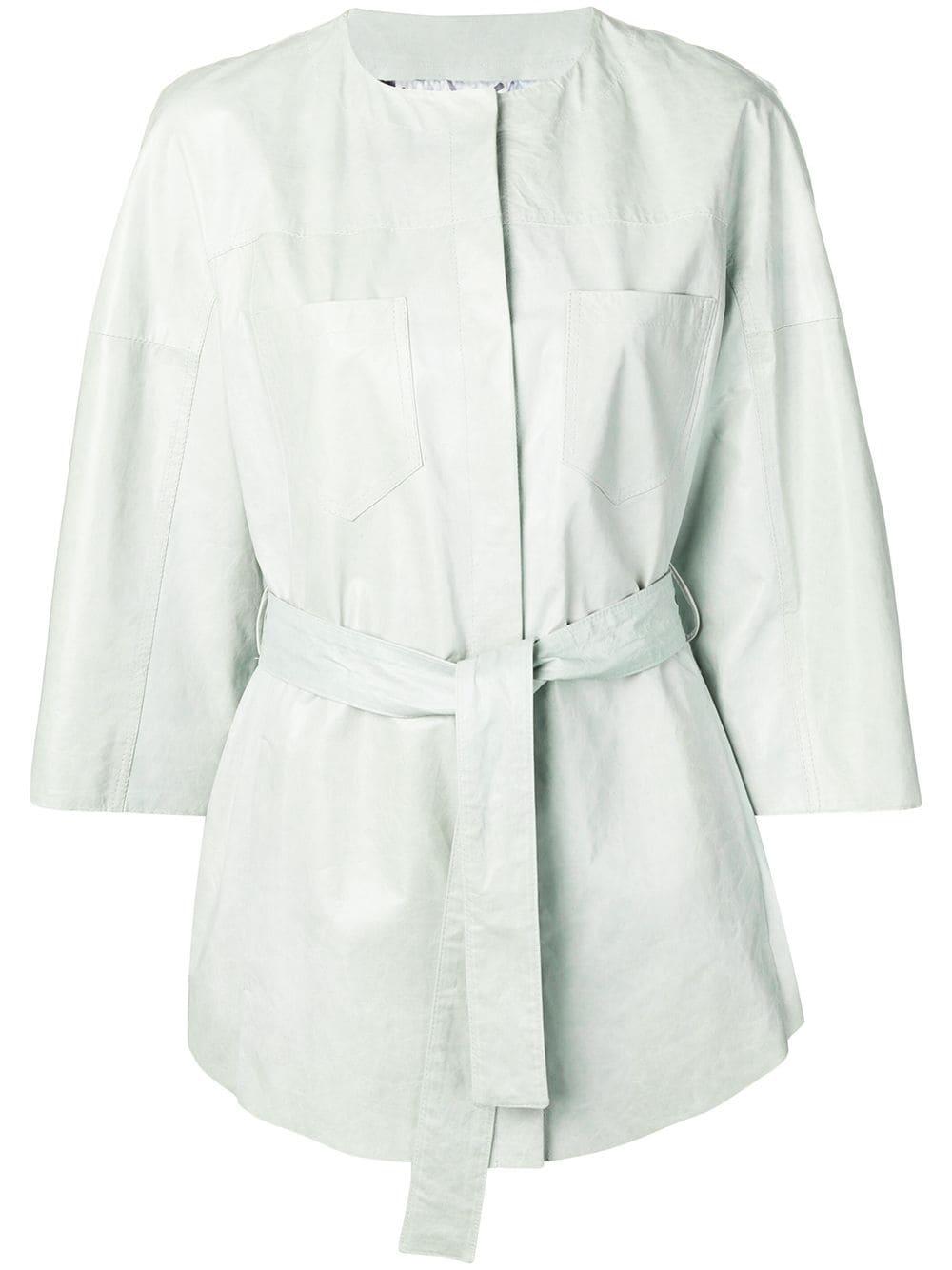Kimono jas van Drome uitgevoerd in leder voorzien van ronde hals, driekwartmouwen van verschillende stoffen, open aan de voorkant, ceintuur en zakken voorzijde. Dit artikel valt normaal qua maat. Kleur: groen