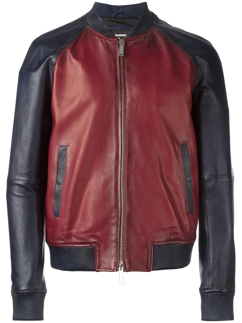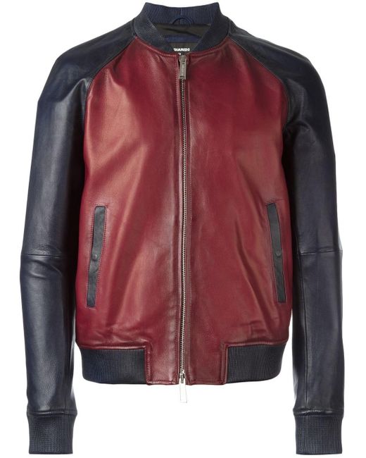 Contrasted leather bomber jacket van Dsquared2 voorzien van geribbelde opstaande kraag, tweeweg ritssluiting, lange mouwen, voering met logo-print en geribde zoom en manchetten. Kleur: rood