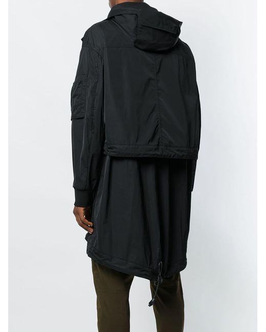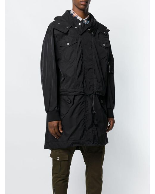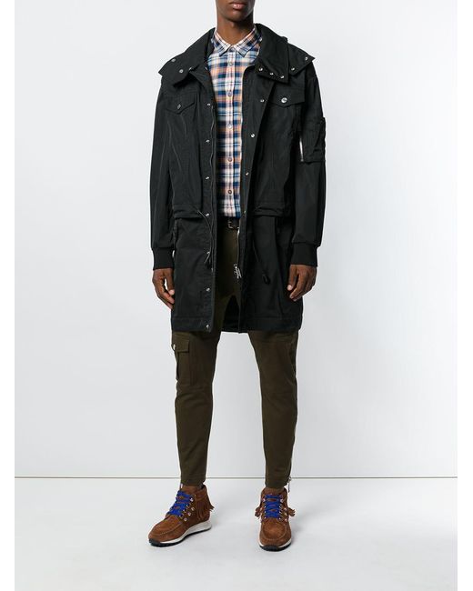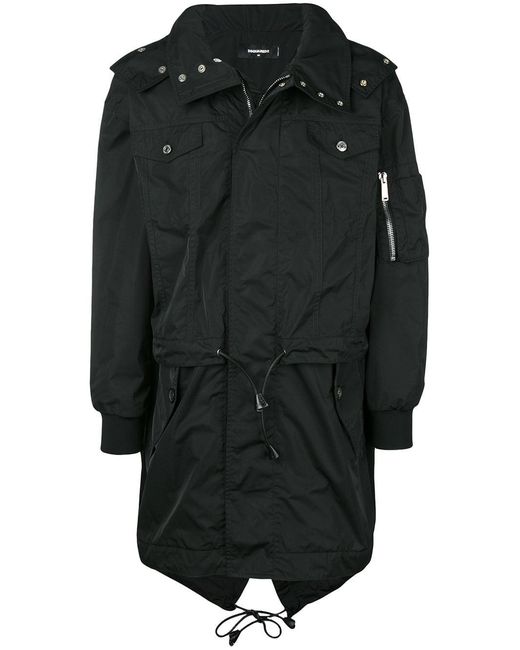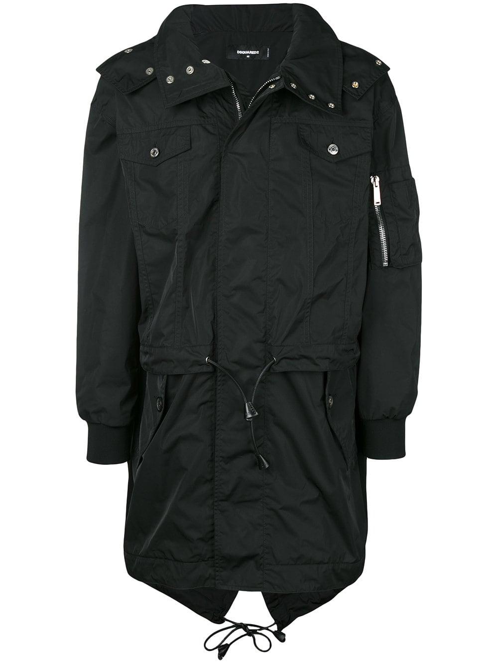 Trenchcoat van Dsquared2 voorzien van capuchon, verborgen ritssluiting, twee borstzakken, elastische taille met een trekkoordsluiting, zak met ritsluiting op mouw, lange mouwen en geribde manchetten. Kleur: zwart