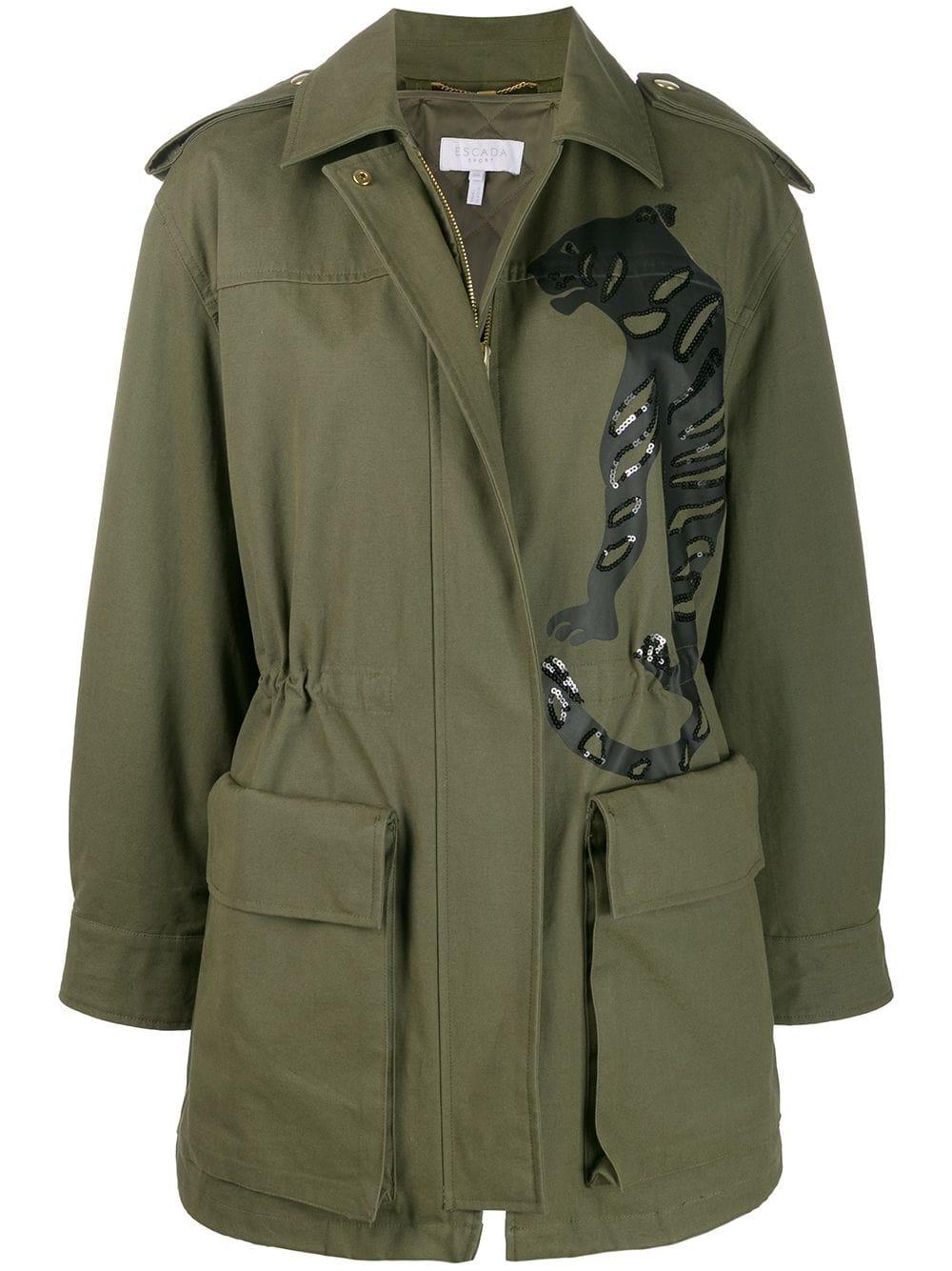 Verfraaide jas van ESCADA SPORT uitgevoerd in katoen voorzien van klassieke kraag, rits aan de voorkant, lange mouwen en voorflapzakken. Kleur: groen