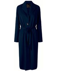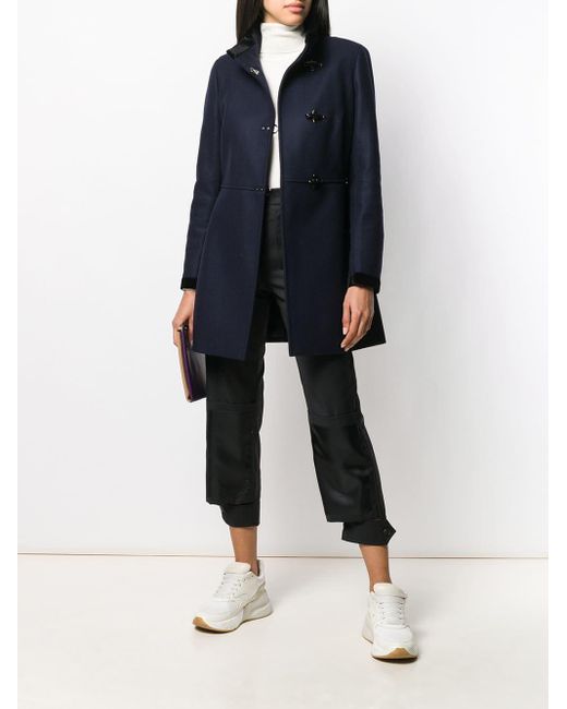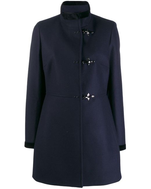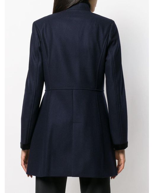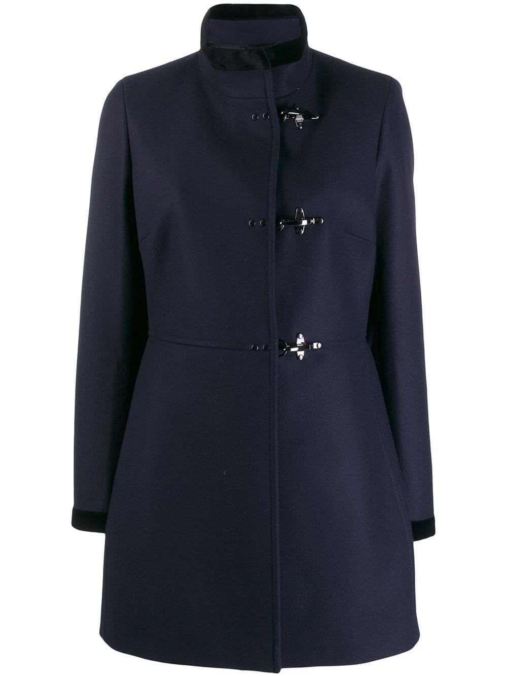 Jas met hoge hals van Fay voorzien van schakelsluiting, lange mouwen, geaccentueerde taille en korte lengte. Kleur: blauw