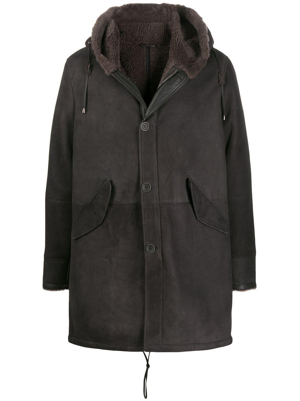Jas met capuchon van Herno uitgevoerd in lamsleer voorzien van drukknop- en ritssluiting, shearling voering, lange mouwen, drukknop- en ritssluiting, zijzakken, relaxte pasvorm, korte lengte en zoom met trekkoord. Kleur: bruin