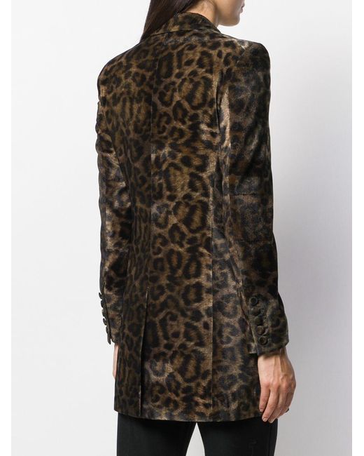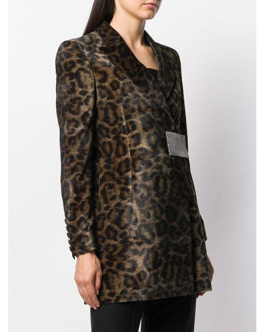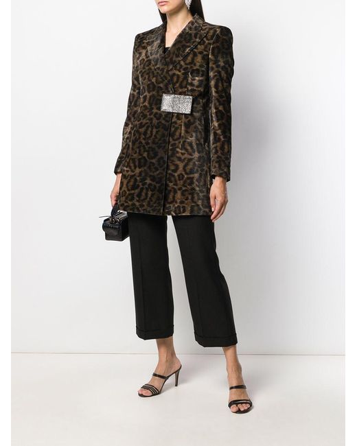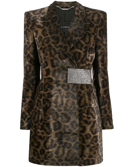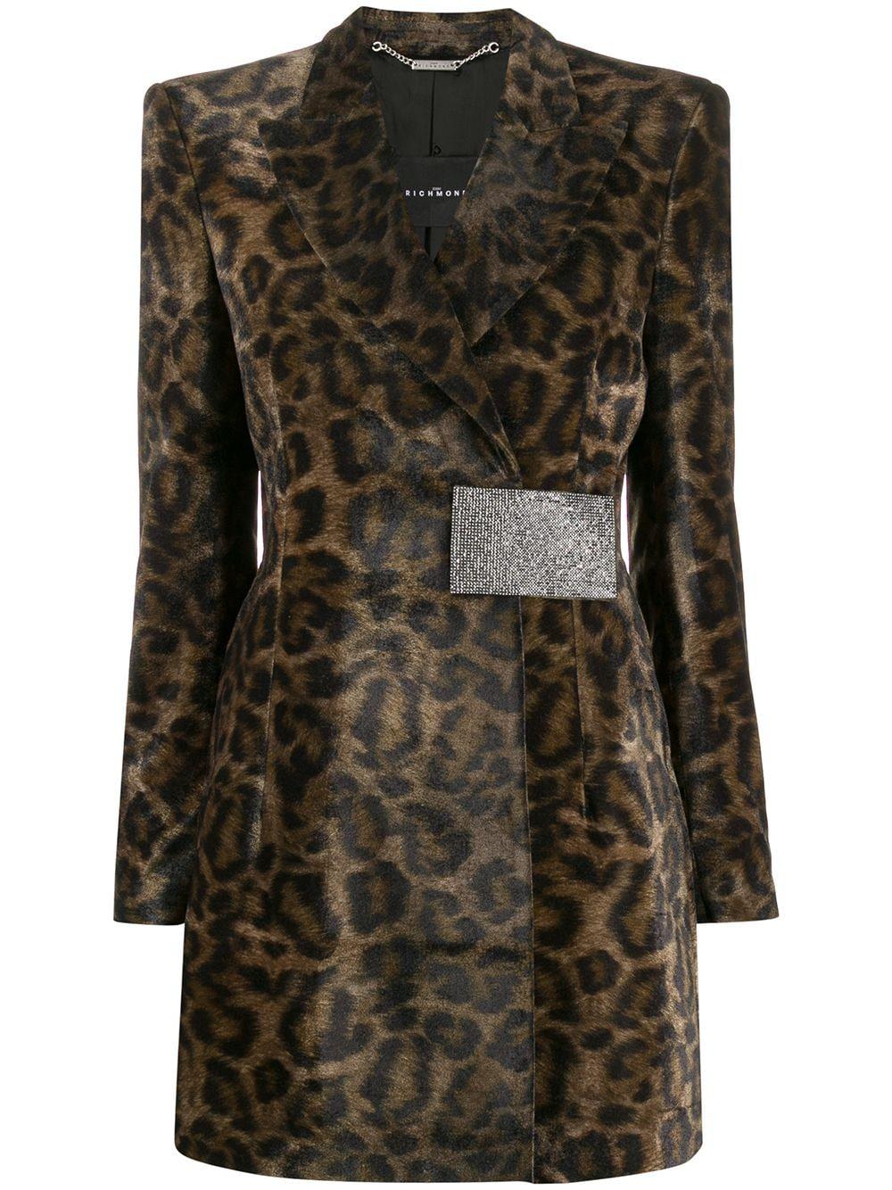 Mantel van John Richmond voorzien van luipaardprint, gestructureerde schouders, brede revers, gewikkeld design, verborgen sluiting voorzijde, kristal accenten en lange mouwen. Kleur: groen
