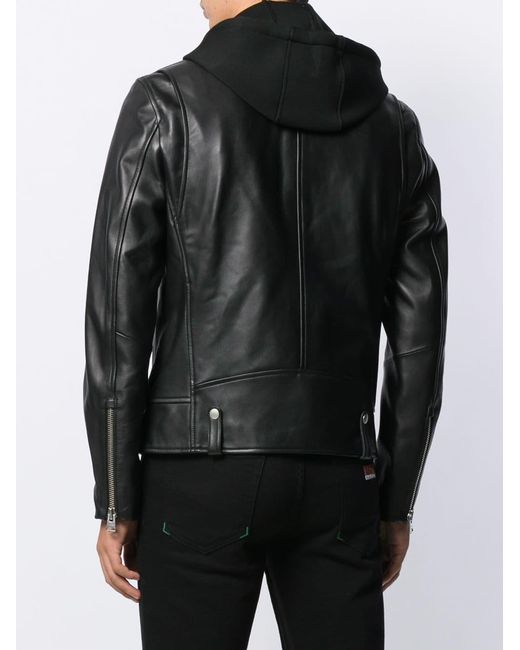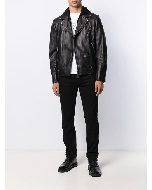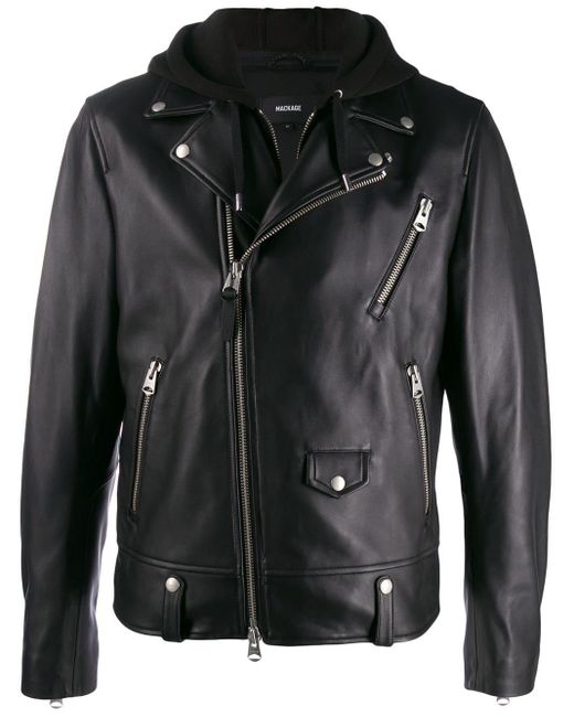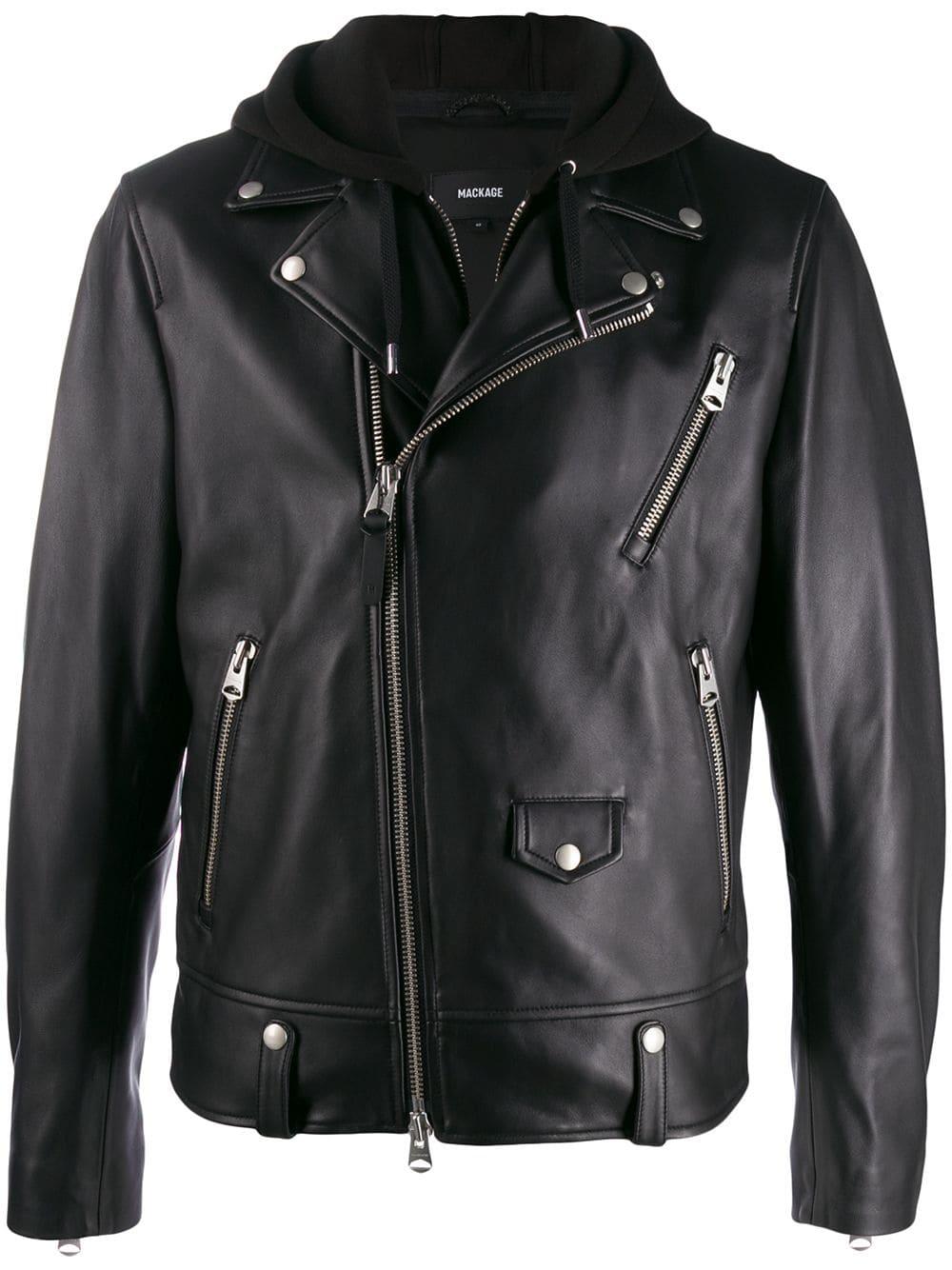 Gelaagd leren jack van Mackage voorzien van niet-gecentreerde ritssluiting vooraan, lange mouwen, zilverkleurige fitting, voorzakken met ritssluiting en korte lengte. Kleur: zwart