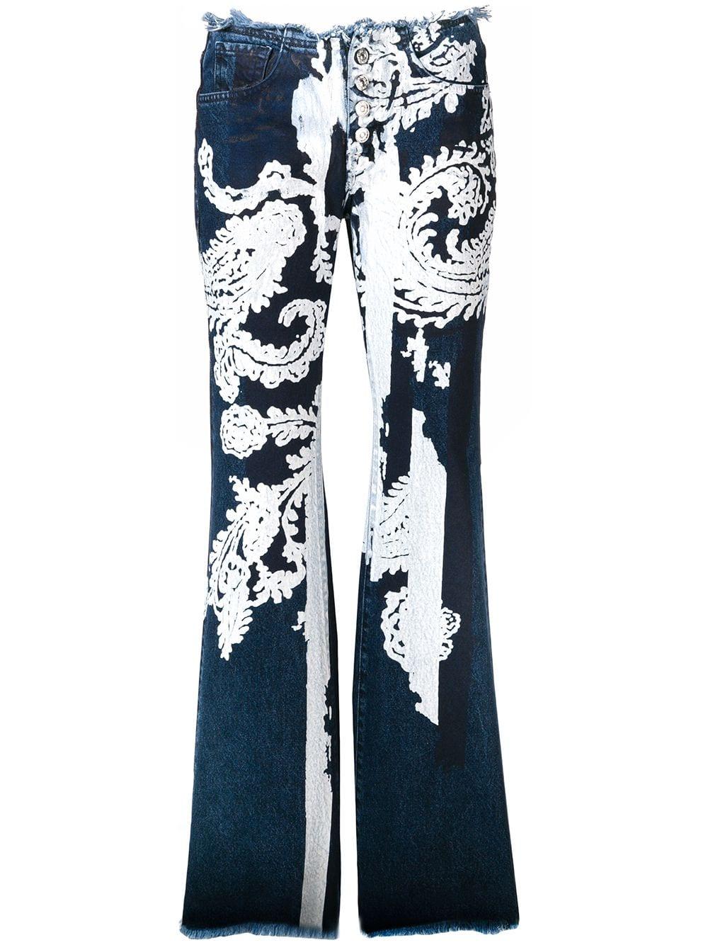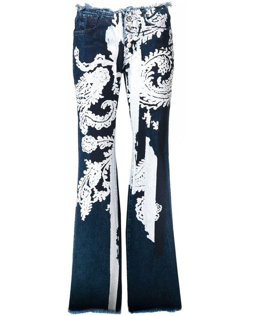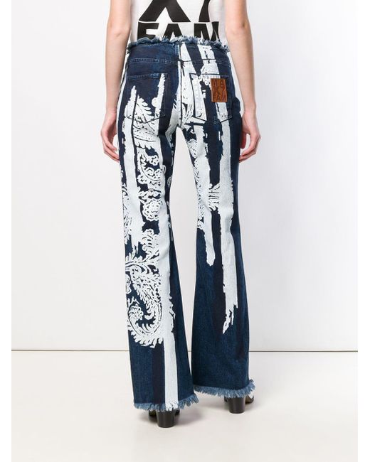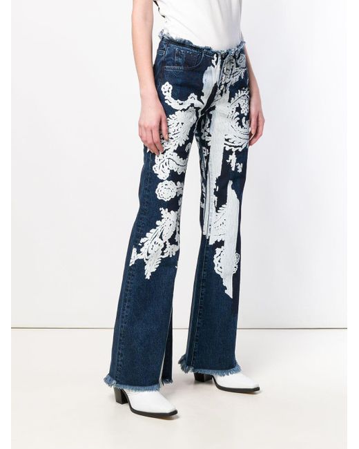 Indigo blue and white cotton paisley stencilled wide leg jeans from Marques Almeida featuring frayed edges, a paisley print, a low rise, a five pocket design and a button fly fastening. Kleur: blauw