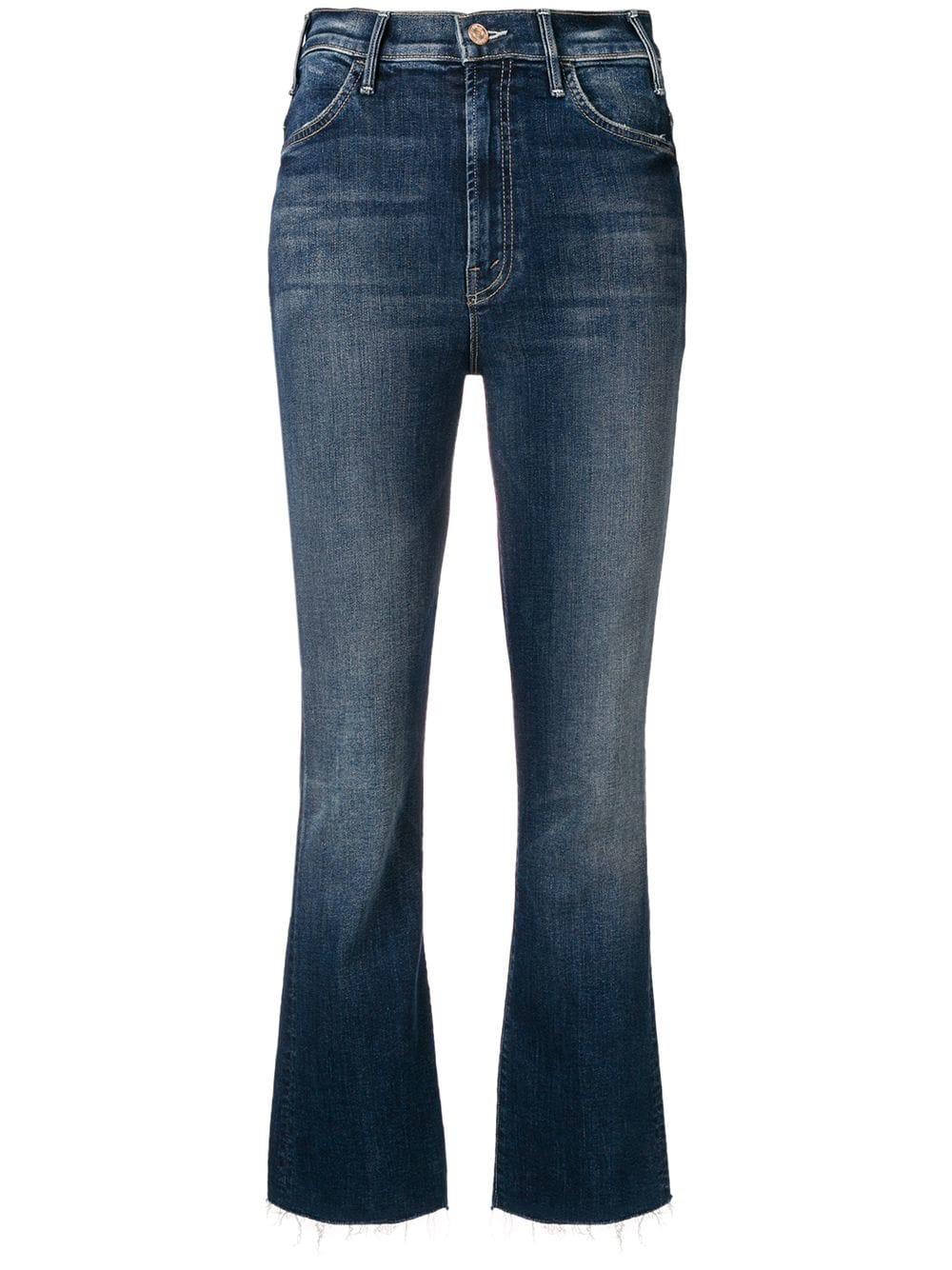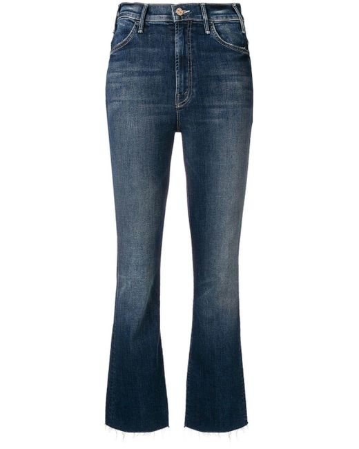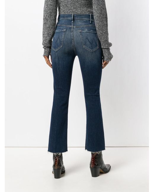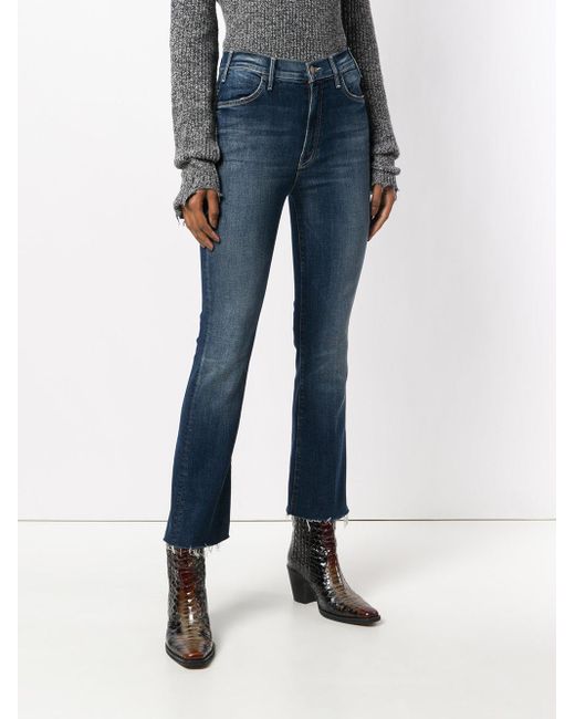 Dark blue stretch cotton blend frayed bootcut cropped jeans from Mother featuring belt loops, a button and zip fly and a five pocket design. Kleur: blauw