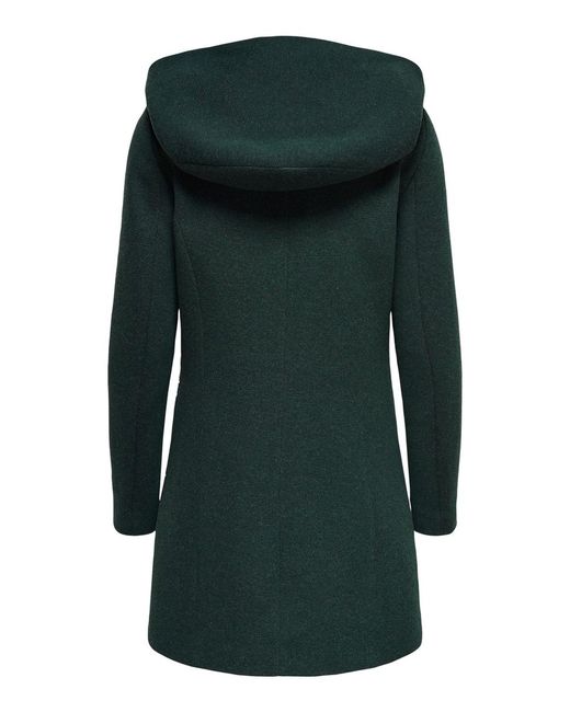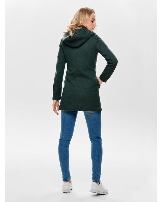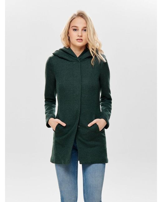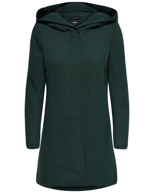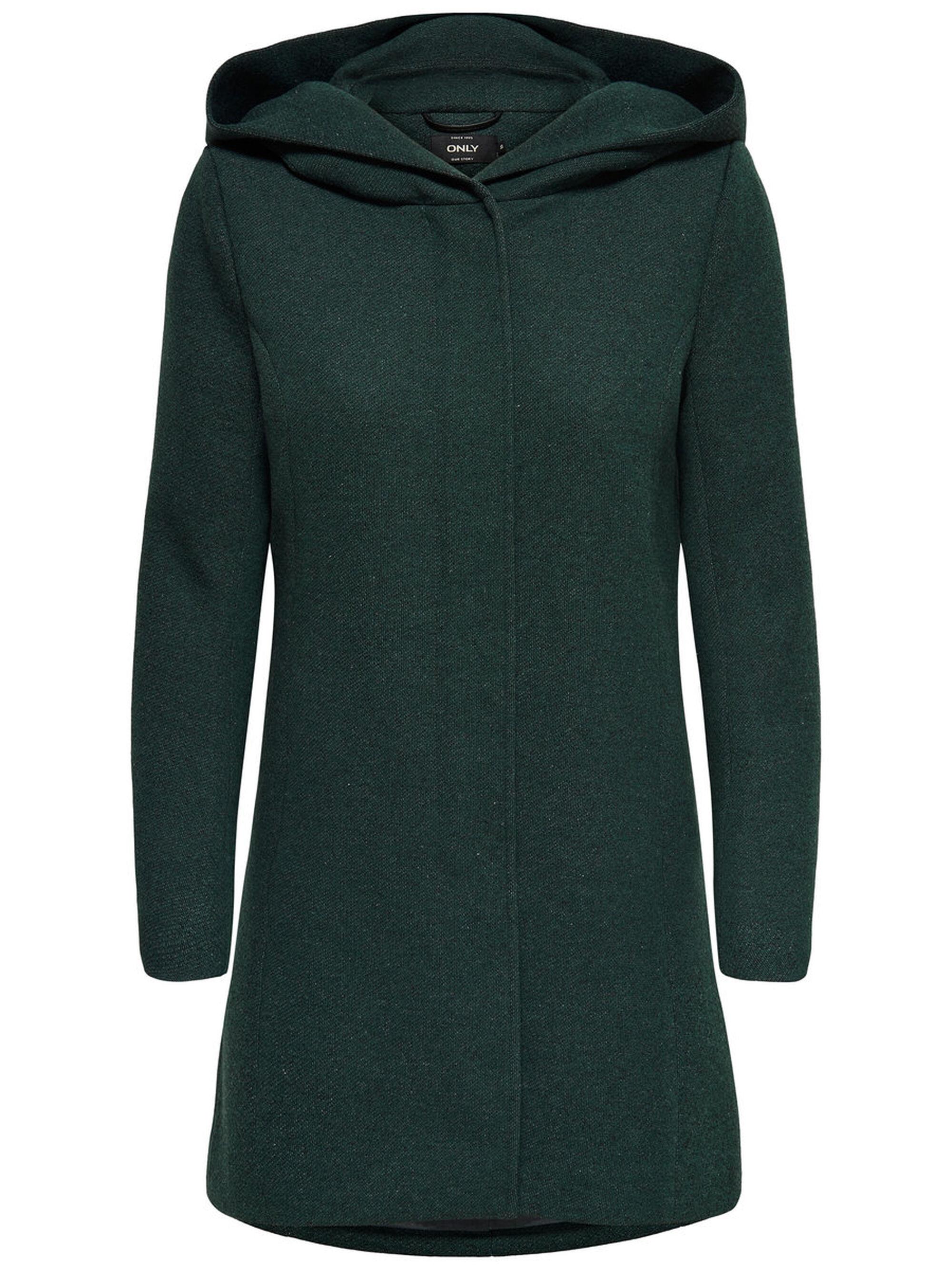 Jas met gedrapeerde capuchon. Verborgen sluiting aan de voorkant. Met 2 paspelzakken aan de voorkant. Lengte: 85 cm in maat M. Het model draagt maat S. Kleur: groen