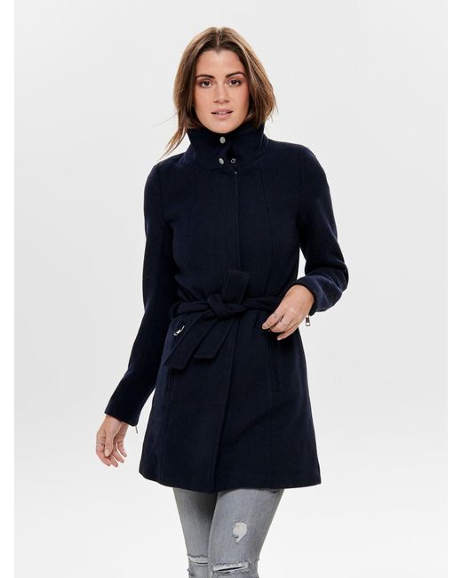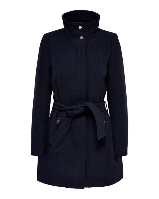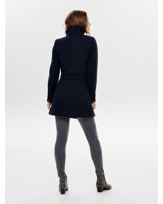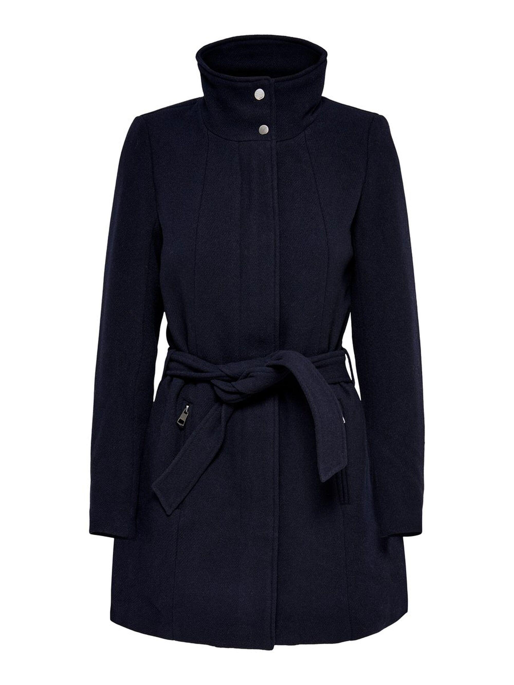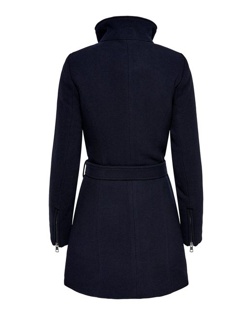 Effen gekleurde wollen jas. Hoge kraag met knopen. Verborgen ritssluiting aan de voorkant. Met 2 zijzakken met rits. Ritsdetails onderaan de mouwen. Riem met riemlussen in de taille. Lengte: 88 cm in maat M. Het model draagt maat S. Kleur: blauw