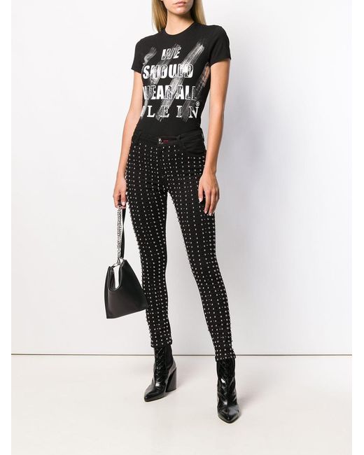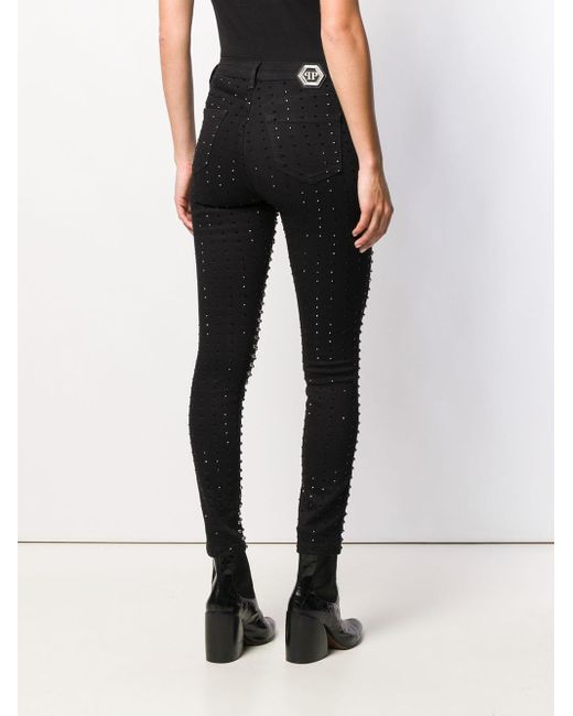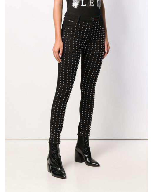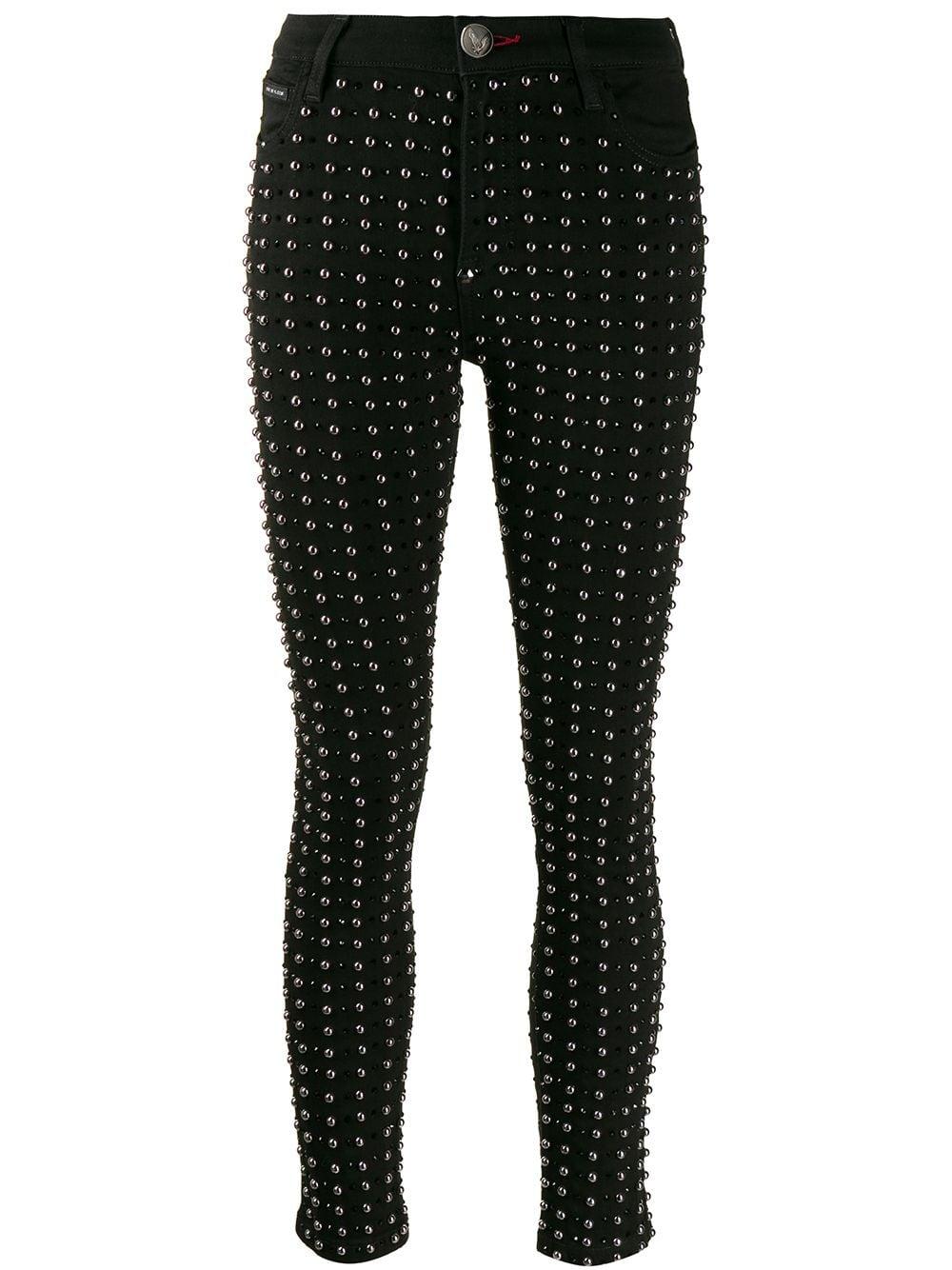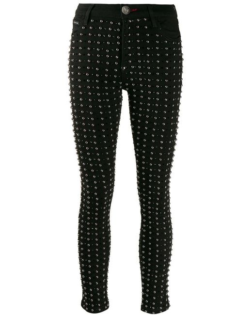 Skinny jeans verfraaid met studs van Philipp Plein uitgevoerd in gemixt katoen voorzien van knoopsluiting, mid-rise, five-pocket-design, tailleband met riemlussen, kleine stud details, skinny fit en zilverkleurige fitting. Kleur: zwart