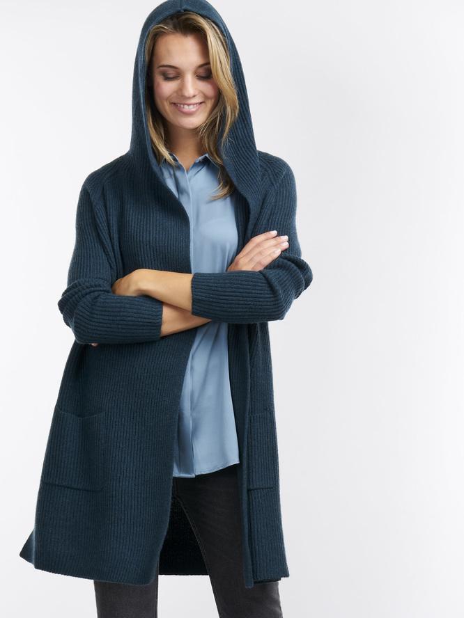 Grof ribbreisel, Lange raglanmouwen, Open voorzijde, Recht gebreide cardigan, Normale pasvorm, Opgestikte zakken, Splitten aan de zijkanten, Verschillende breipatronen, Handwas, chemisch reinigen mogelijk, Ons model is 178 cm lang en draagt maat 36/XS, Capuchon, Middellang. Kleur: groen