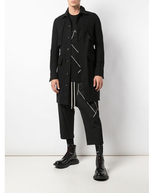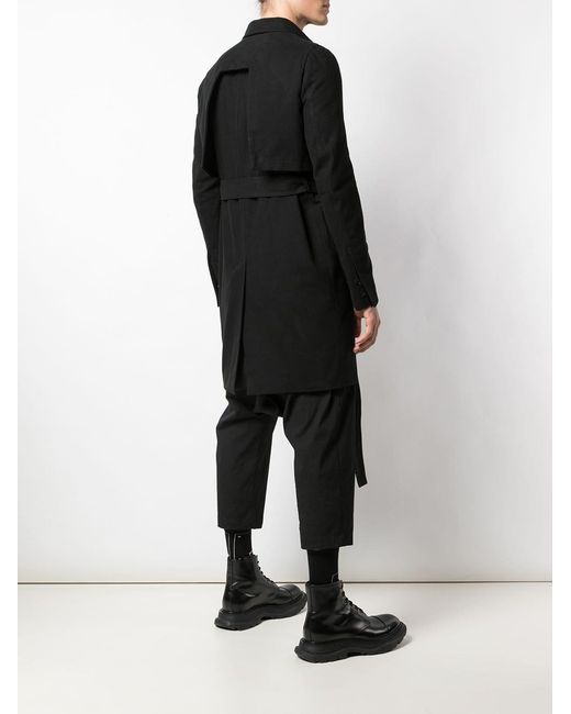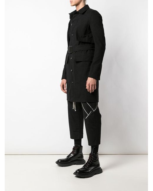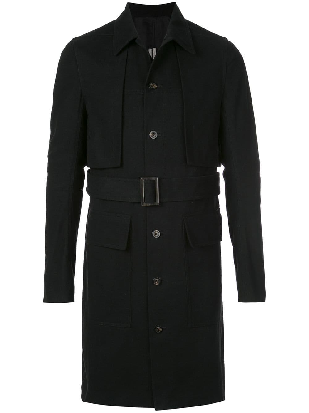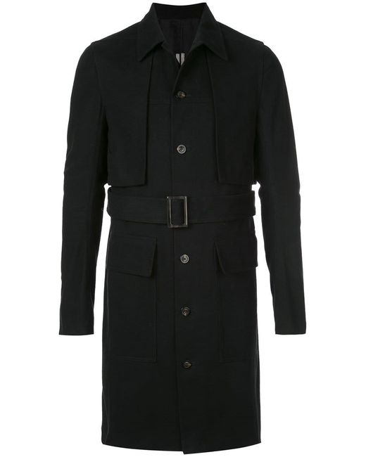 Trenchcoat met ceintuur van Rick Owens uitgevoerd in katoen voorzien van klassieke kraag, ceintuur, lange mouwen, voorflapzakken en knoopsluiting. Kleur: zwart