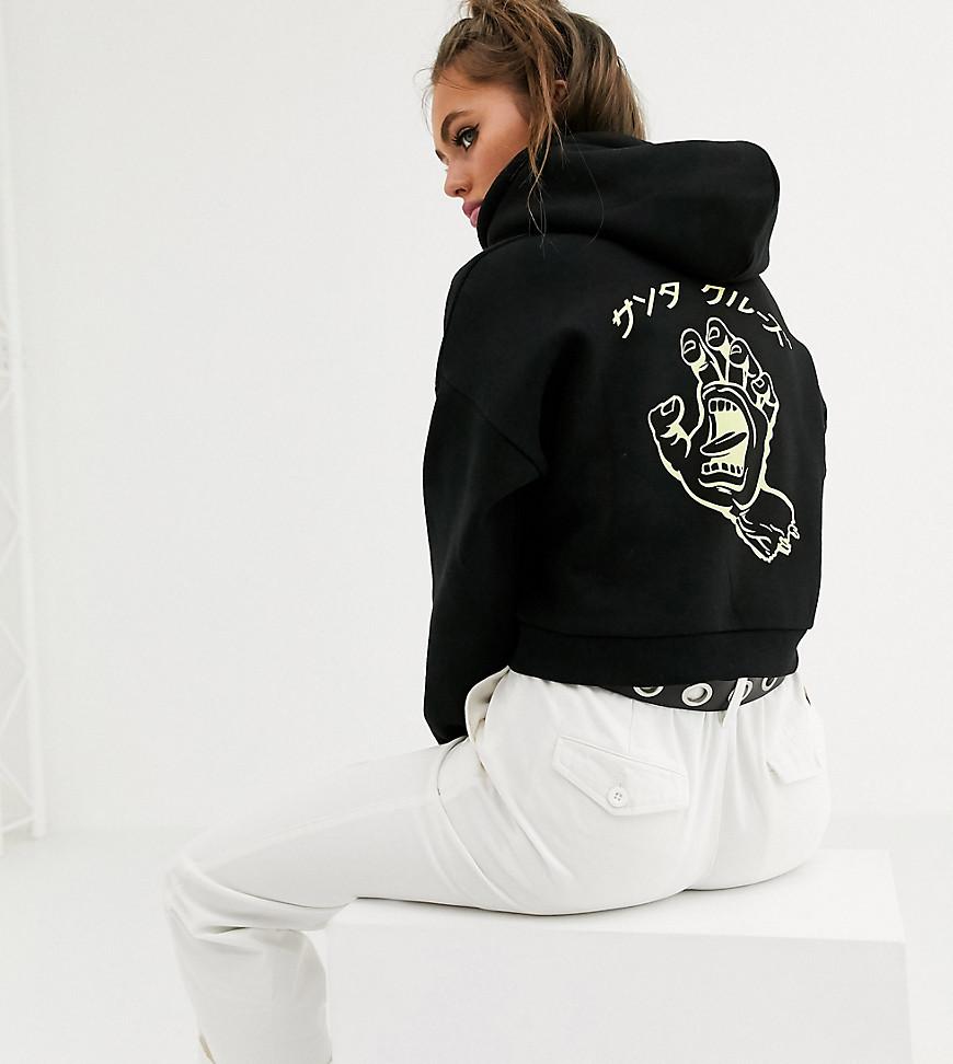 Hoodie van Santa Cruz, Behaaglijk zag er nog nog nooit zo goed uit, Pulloverstijl, Capuchon met trekkoord, Verlaagde schouders, Print op voor- en achterkant, Geribbelde boorden, Cropped model, Ruimvallende pasvorm, Ruimvallende pasvorm, Exclusief bij ASOS. Het skateboard merk Santa Cruz is wereldberoemd door hun originele boards met prachtige graphics. De kledinglijn is minstens even cool als hun cruisers. De collectie bestaat uit boyfriend T-shirts, tankjurkjes en hoodies, allemaal voorzien van unieke graphics en pop-art logo prints. Katoen/ koord/ polyester/ print. Kleur: zwart