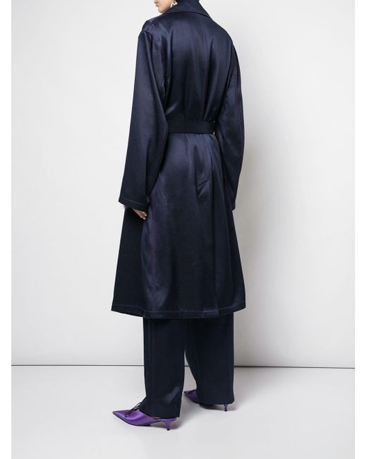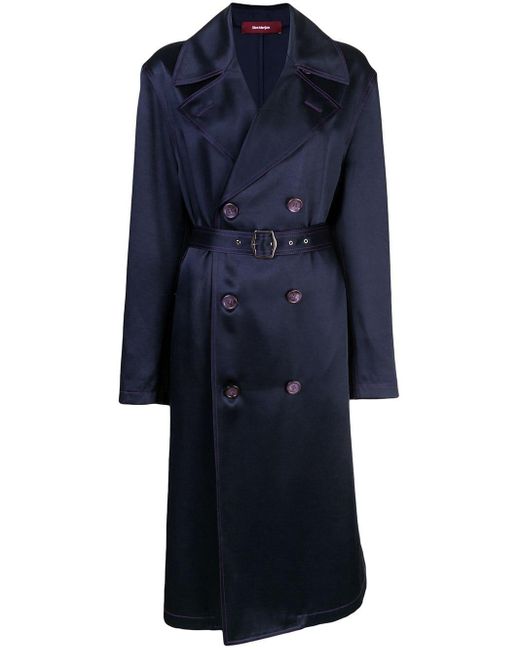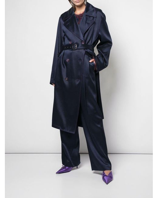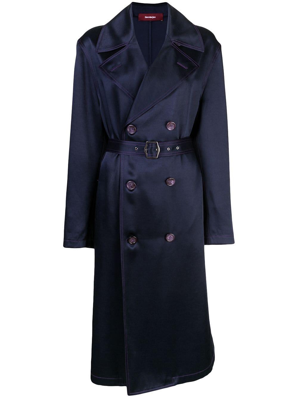 Navy blue twill satin Sigourney double-breasted trench coat from SIES MARJAN featuring a wide lapel, side pockets, a belted waist and a mid-length. Kleur: blauw