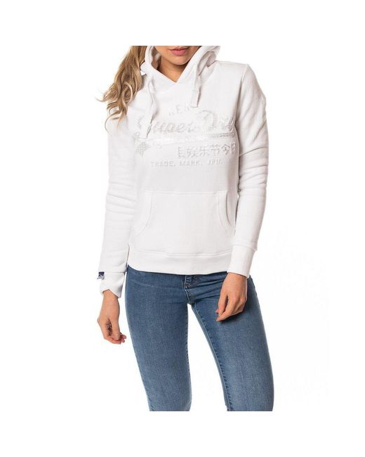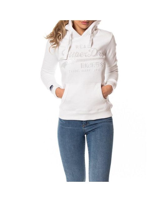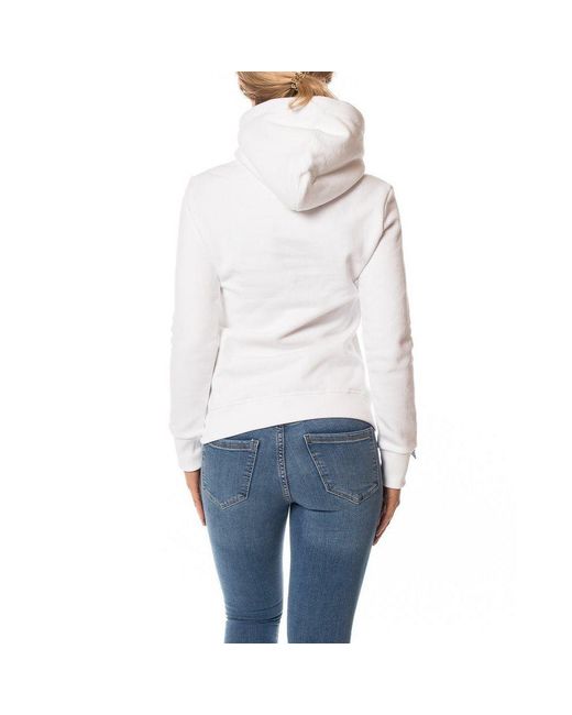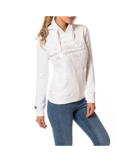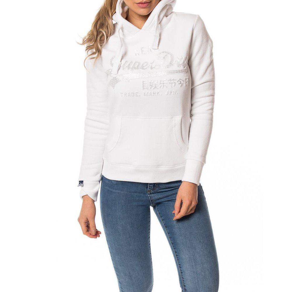 Dames hoodie van Superdry, de vintage logo emboss entry hood in het wit, logo op de borst met daarop een subtiele glitter, glitter bestaat uit heel vaak klein het woordje superdry in glimmende letters, capuchon met een groot wit touwtje erdoorheen, 1 grote buidelzak op de buik, goede stevige boorden aan de mouwen en aan de onderkant, lekker zacht aan de binnenkant. 82% katoen met 18% polyester. Kleur: wit