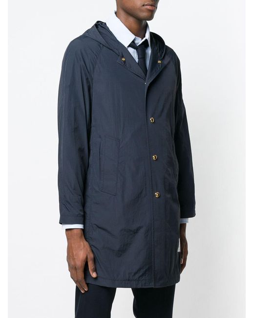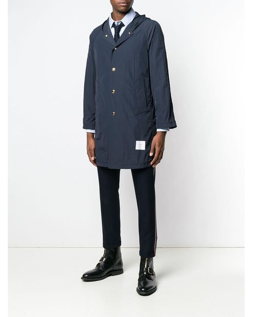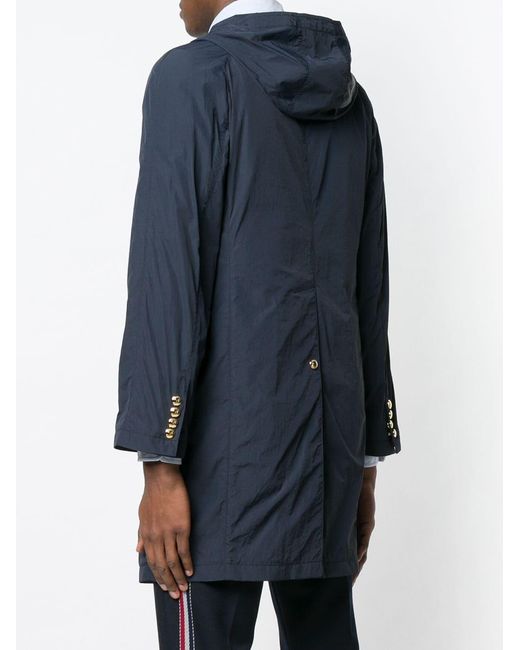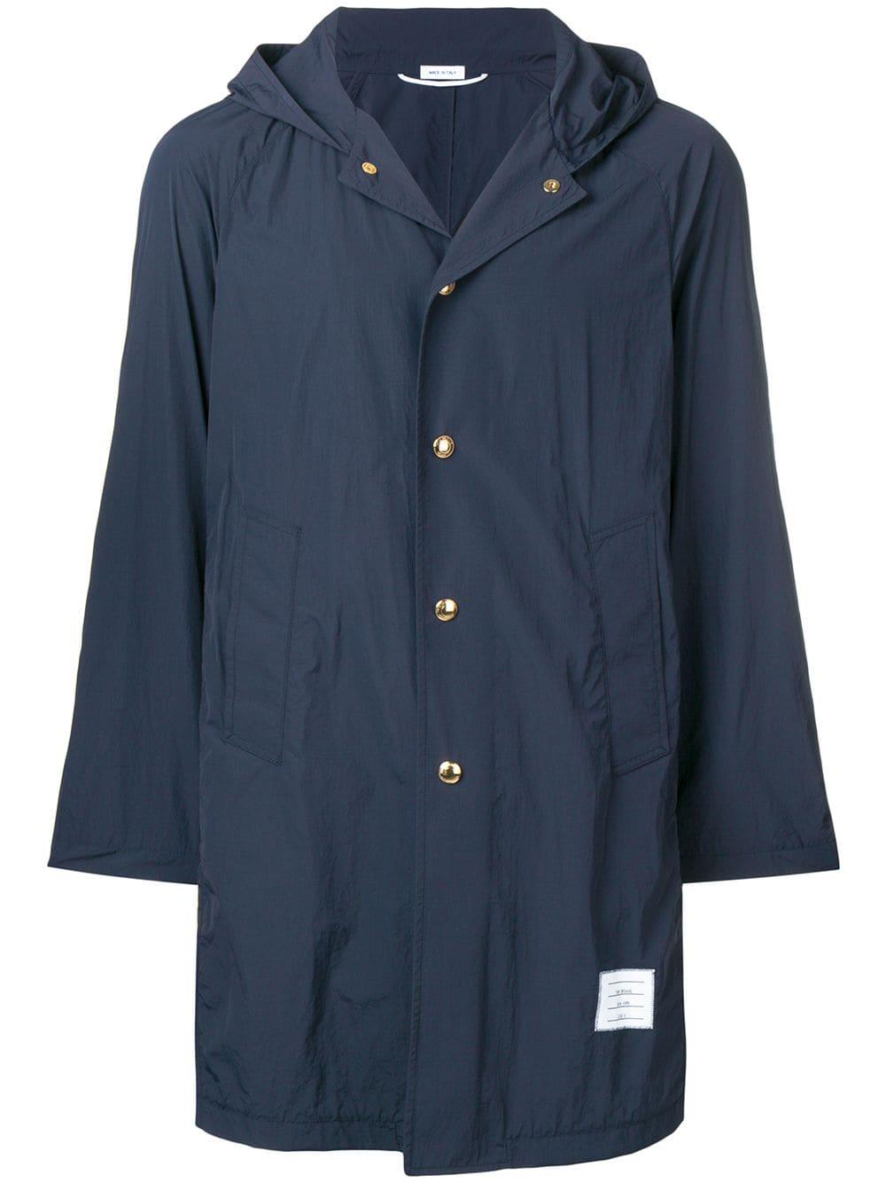 Nylon overjas met capuchon van Thom Browne voorzien van straight-fit, drukknoop sluiting, lange raglan mouwen, knoopmanchetten, zijzakken, korte lengte, capuchon en gecentreerd slot aan de achterkant. Kleur: blauw