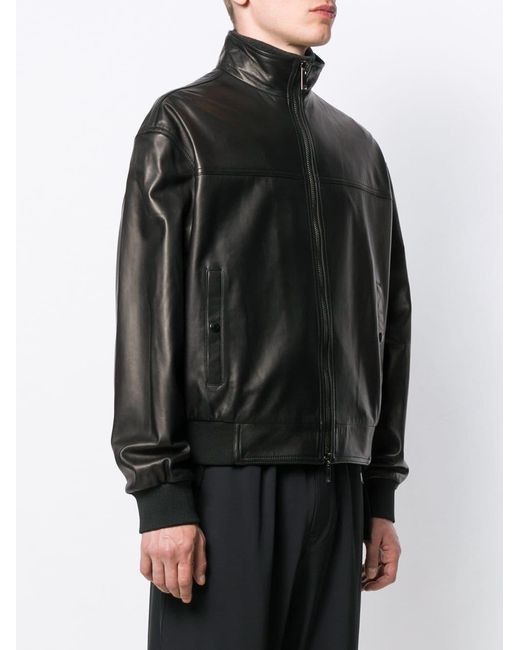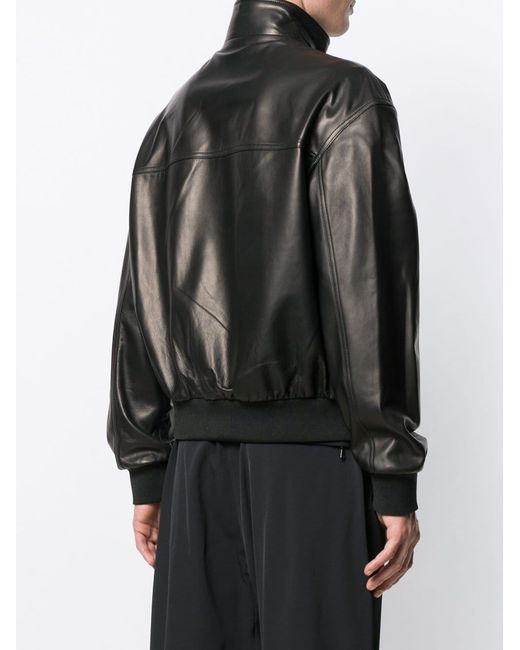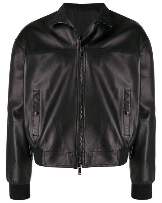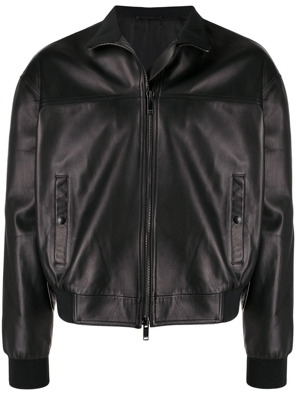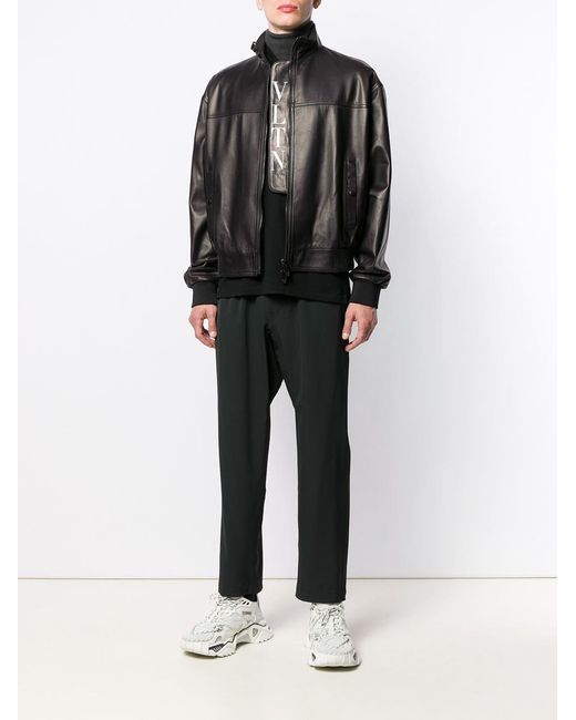Leren bomberjack van Valentino uitgevoerd in lamsleer voorzien van rechtopstaande kraag, rits aan de voorkant, geprint logo aan voorzijde, lange mouwen en geribde zoom en manchetten. Kleur: zwart