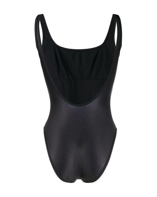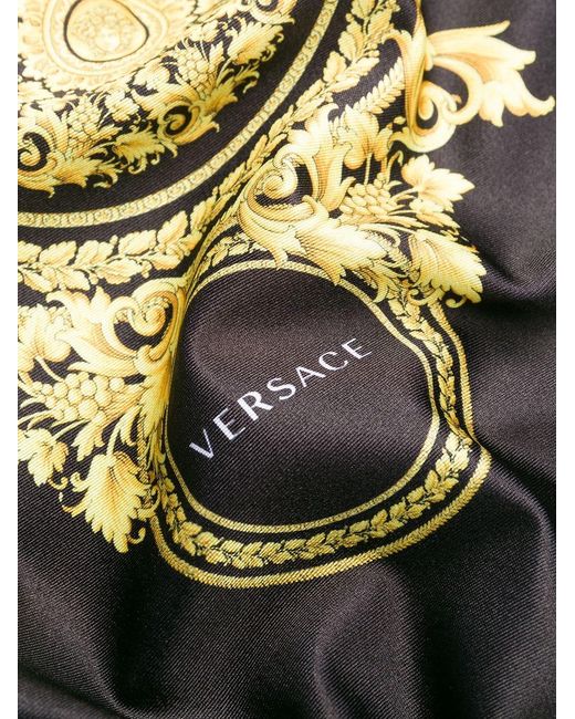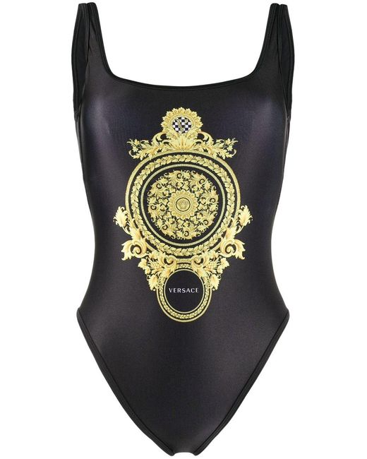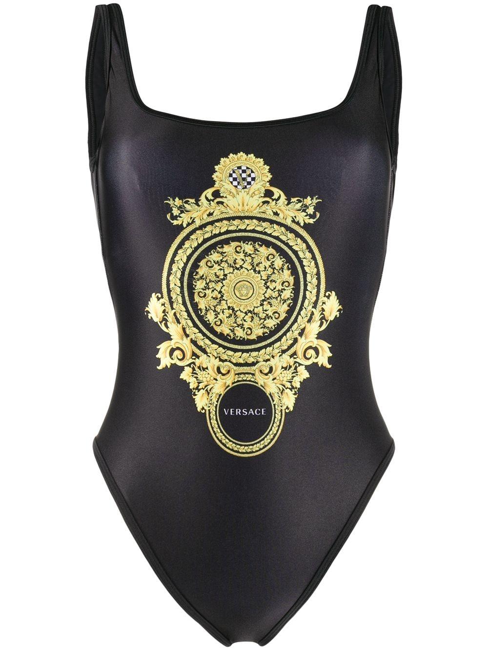 Badpak met barokprint van Versace voorzien van vierkanten kraag, ronde achteruitsnede en print op de voorkant. Kleur: zwart