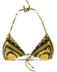 Bikinitop met barokprint van Versace voorzien van halter halslijn, knoopsluiting, bandeau en barok patroon. Kleur: geel