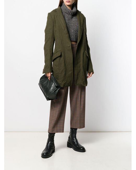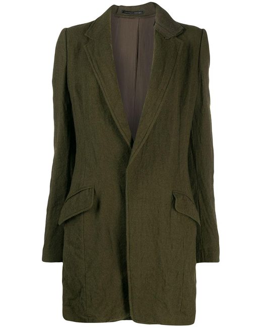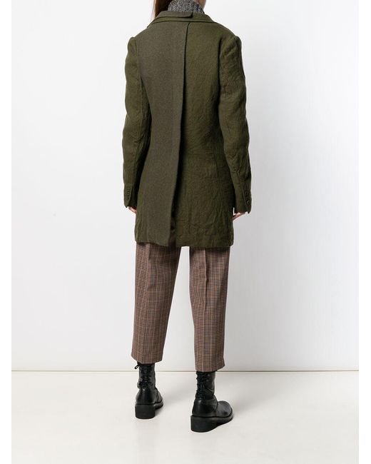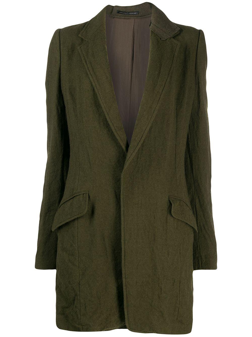 Khaki green organic wool fitted single-breasted coat from Y's featuring a crinkled design, notched lapels, a snap button closure, front flap pockets, long sleeves, button cuffs and a rear central vent. Kleur: groen