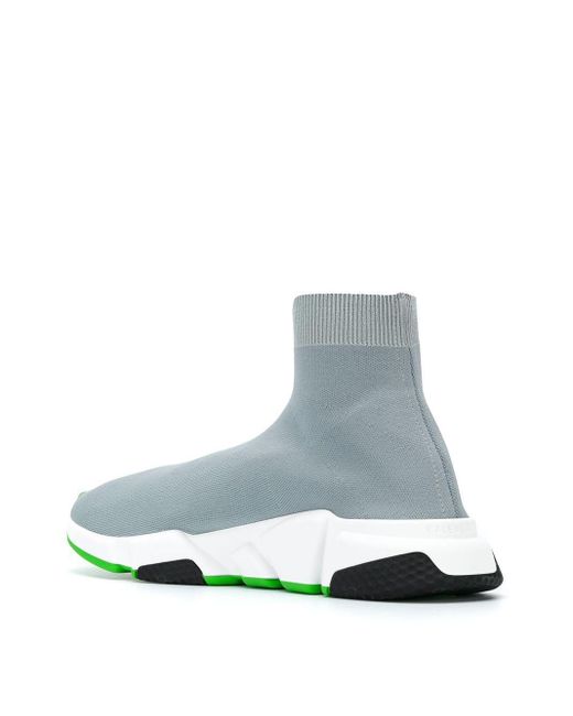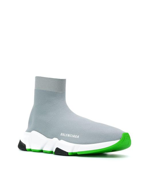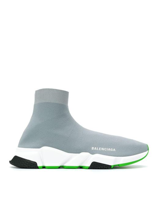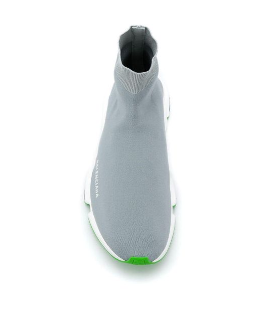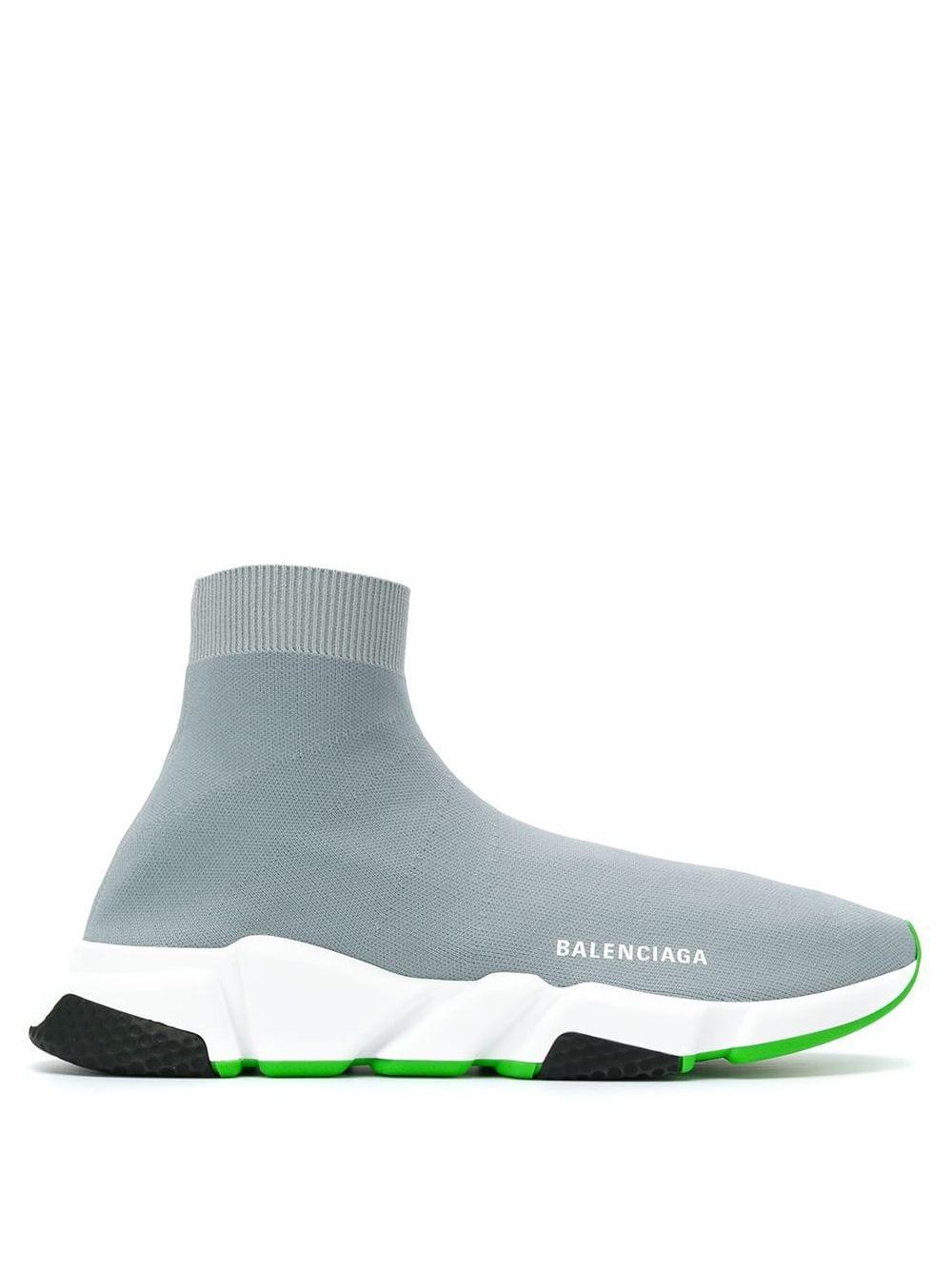 Speed gebreide sneakers van Balenciaga voorzien van enkelhoog, gebreide stijl, logo aan de buitenkant en geribbelde rubberen zool. Kleur: grijs