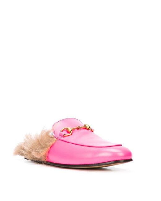 Met bont gevoerde Princetown loafers van Gucci voorzien van amandelvormige neus, gladde oppervlakte met een matte afwerking, goudkleurige gesp, stiksels, instappers, logo in reliëf in het voetbed en platte leren zool. Kleur: roze