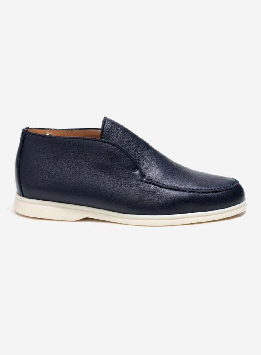 Instapper-Water. En vuilafstotende finish-Zachte kwaliteit-Wapiti leder-Elastische tab-Handgestikte neus. Buitenzijde: 100% wapiti leer-Binnenzijde: 100% kalfsleer-Zool: anti-slip rubber-Made in Italy. Kleur: blauw