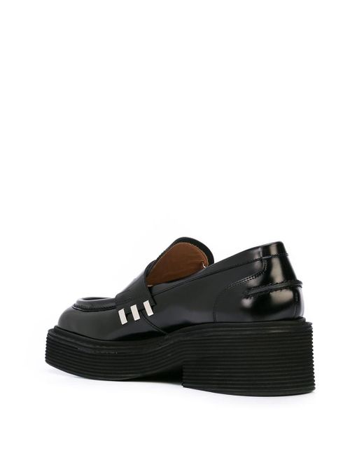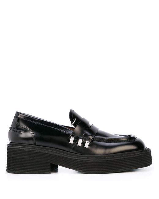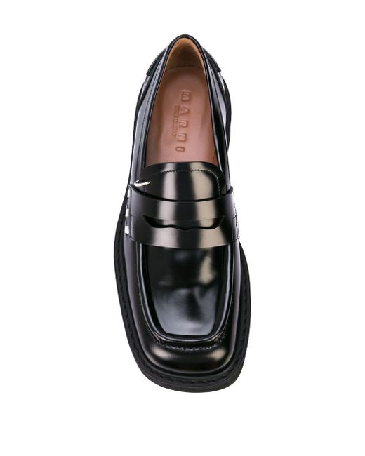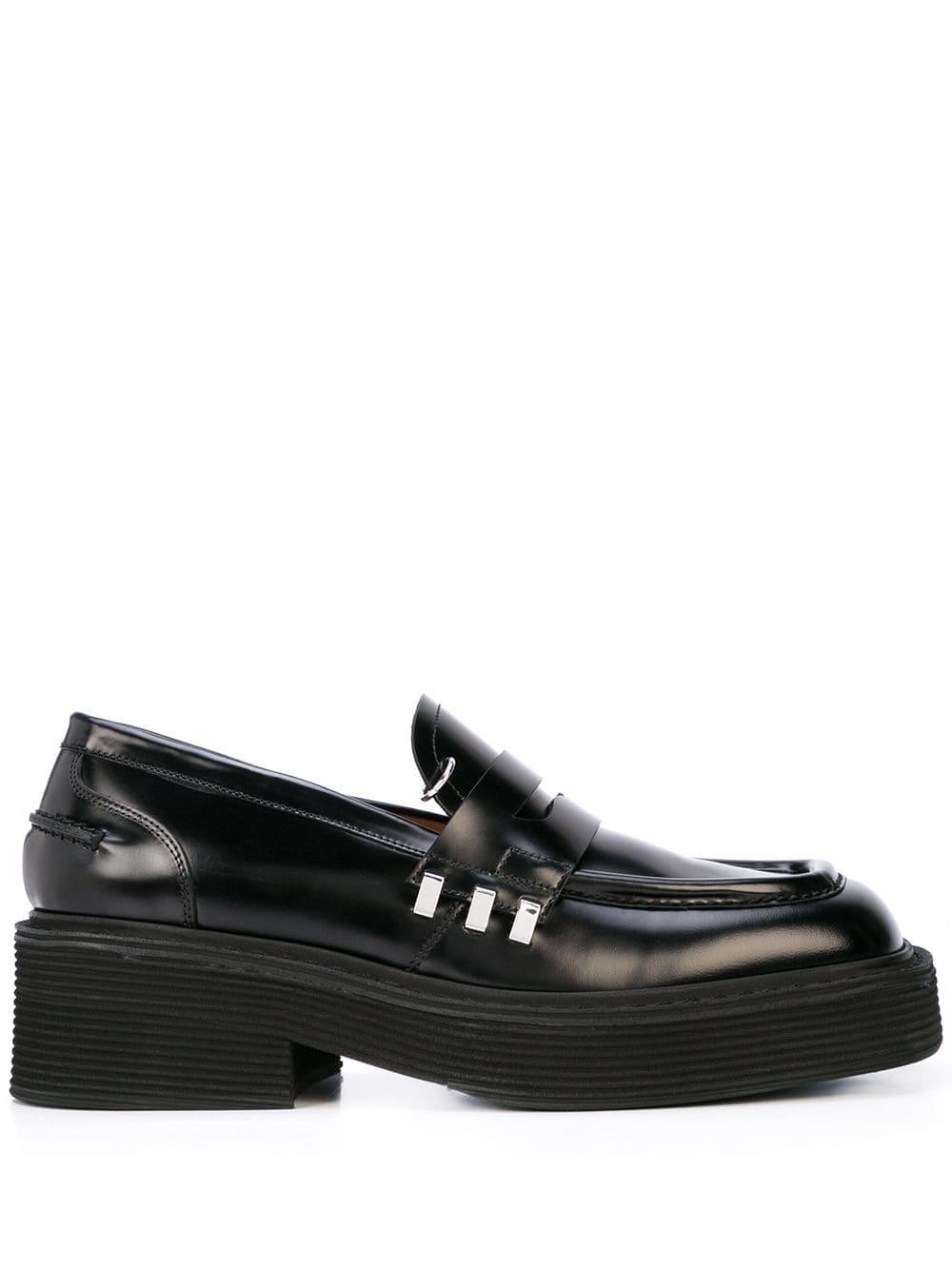 Famous for its prints, Marni offers eclectic styles season after season, characterized by an experimental approach to materials and colour, and these black calf leather chunky sole penny loafers are a stand-out. Featuring a square toe, a high vamp and silver-tone hardware. Kleur: zwart