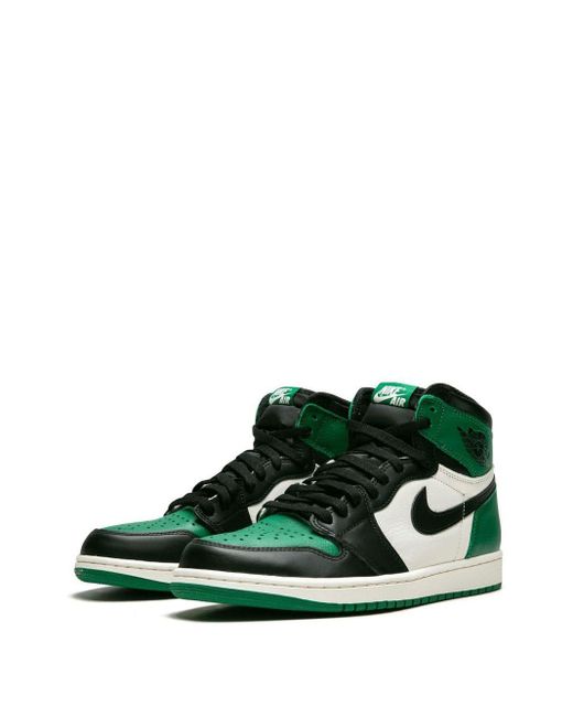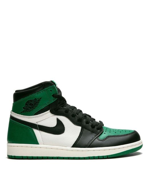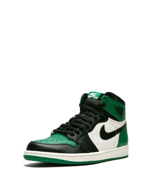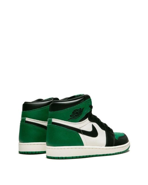 Air Jordan 1 Retro High OG sneakers van jordan uitgevoerd in leder voorzien van ronde neus, veters aan voorkant, logo embleem op de tong, binnenzool met logo-afdruk, gewatteerde enkel, contrasterend colourblock design, kenmerkende Nike swoosh en rubberen zool. Kleur: groen