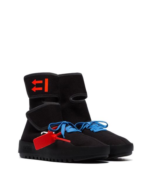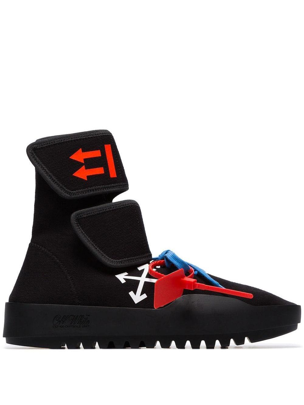 Zwarte Motor wikkelsneakers van Off-White voorzien van geribbelde rubberen zool, ronde neus, klittenbandsluiting en veters aan voorkant. Kleur: zwart