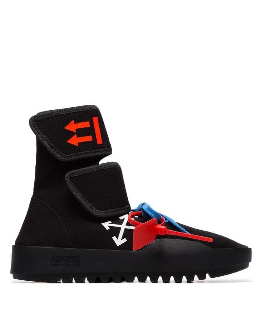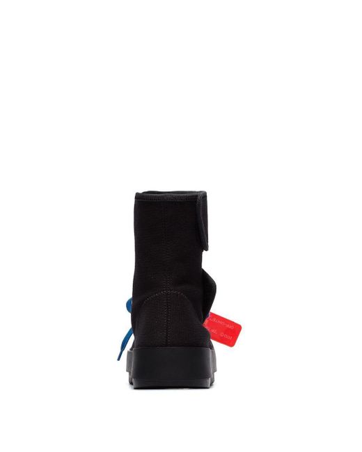 High top sneakers met omslag en pijl print van Off-White voorzien van geribbelde rubberen zool, ronde neus en veters aan voorkant.