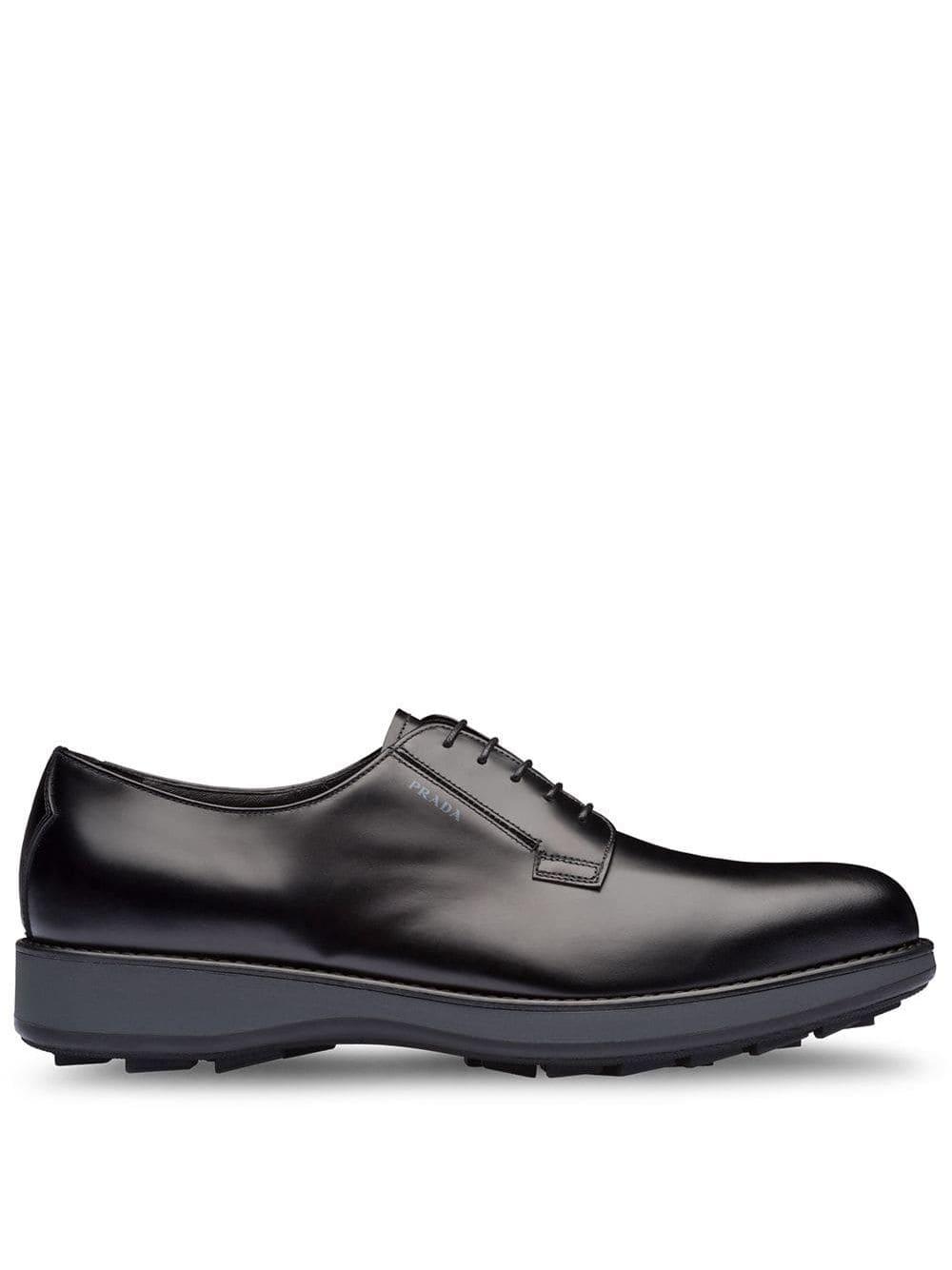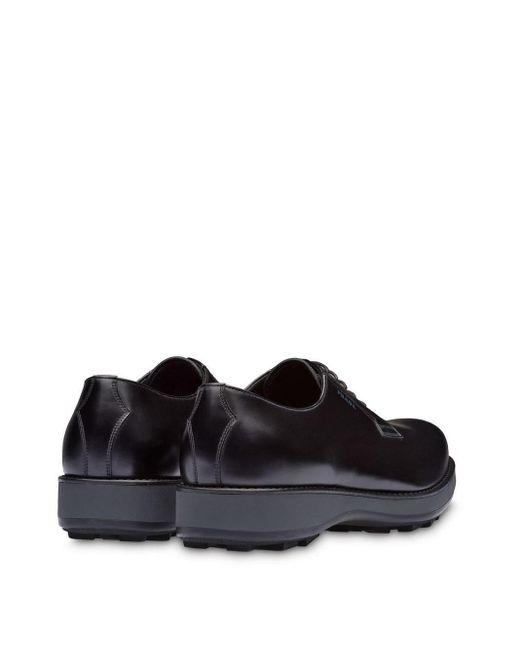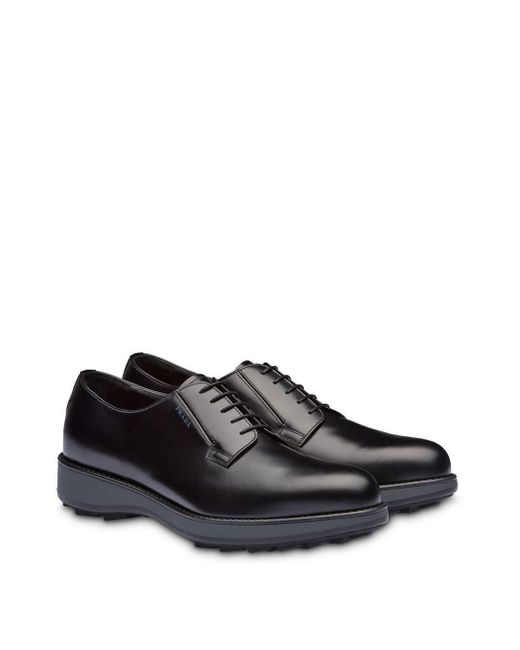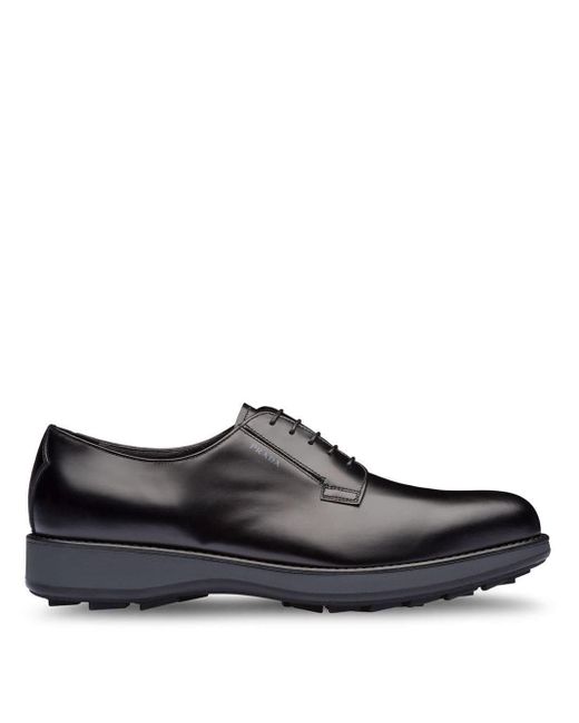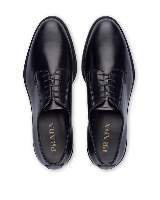 Derby schoenen van geborsteld leer van Prada voorzien van amandelvormige neus, veters aan voorkant en platte rubberen zool. Kleur: zwart