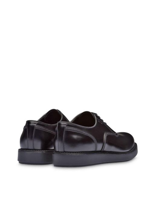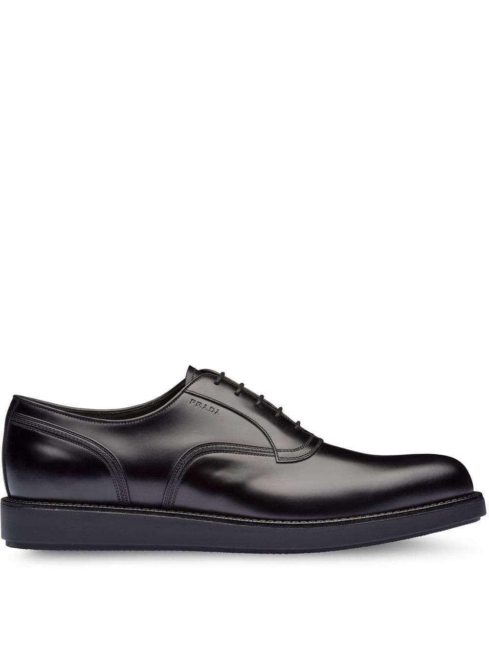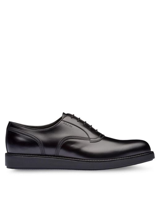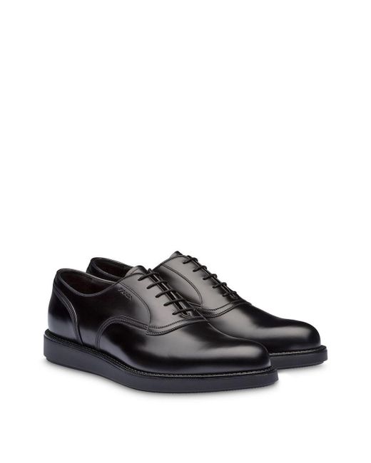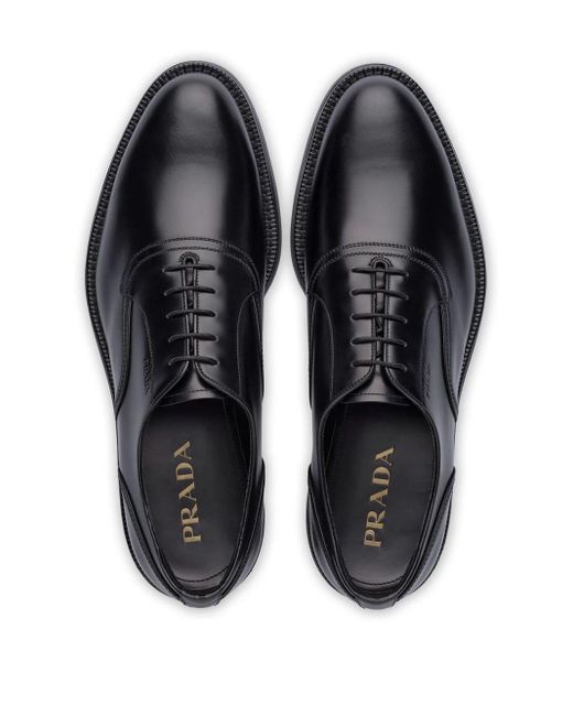 Oxford schoenen van Prada voorzien van amandelvormige neus, veters aan voorkant, logo met reliëf en rubberen zool. Kleur: zwart