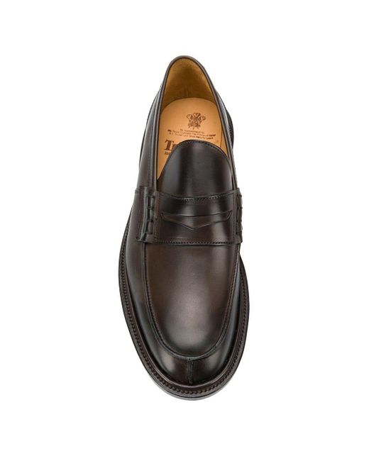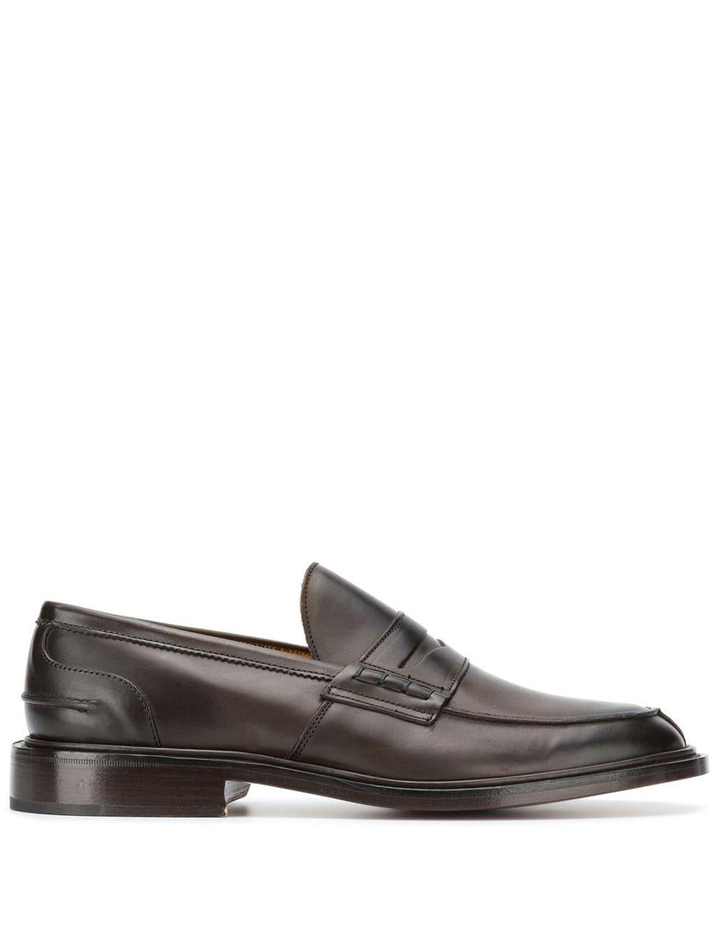 James loafers van Trickers uitgevoerd in leder voorzien van instappers, amandelvormige neus, lage blokhak, leren voetbed en leren zool. Kleur: bruin