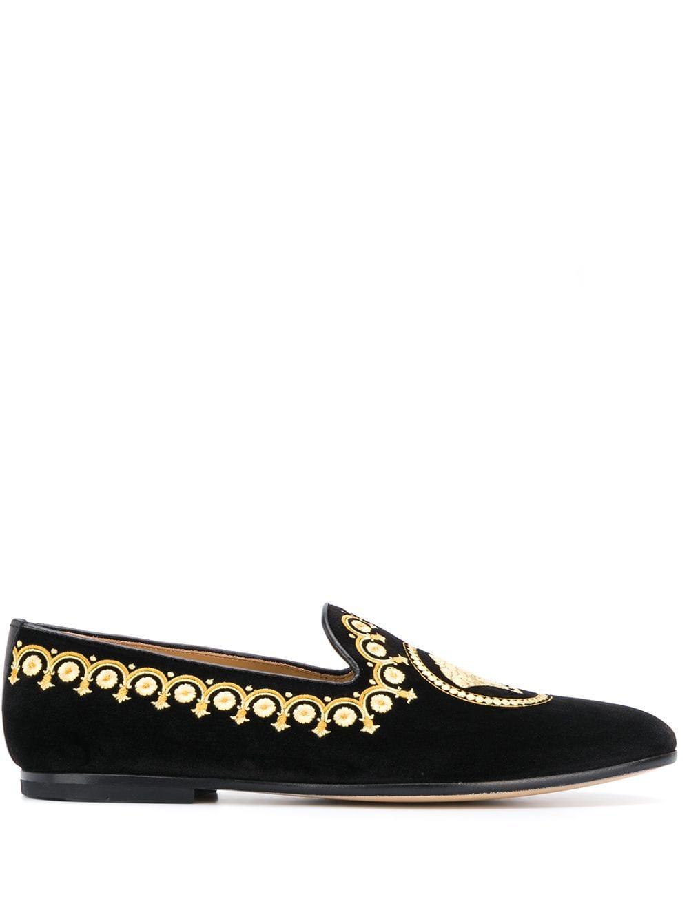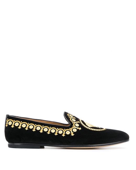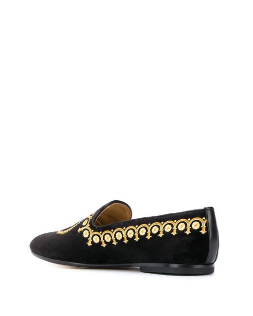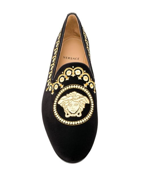 Loafers met Medusa logo van Versace voorzien van amandelvormige neus, Medusa-applicatie, bedrukt, platte leren zool en binnenzool met logo-afdruk. Kleur: zwart